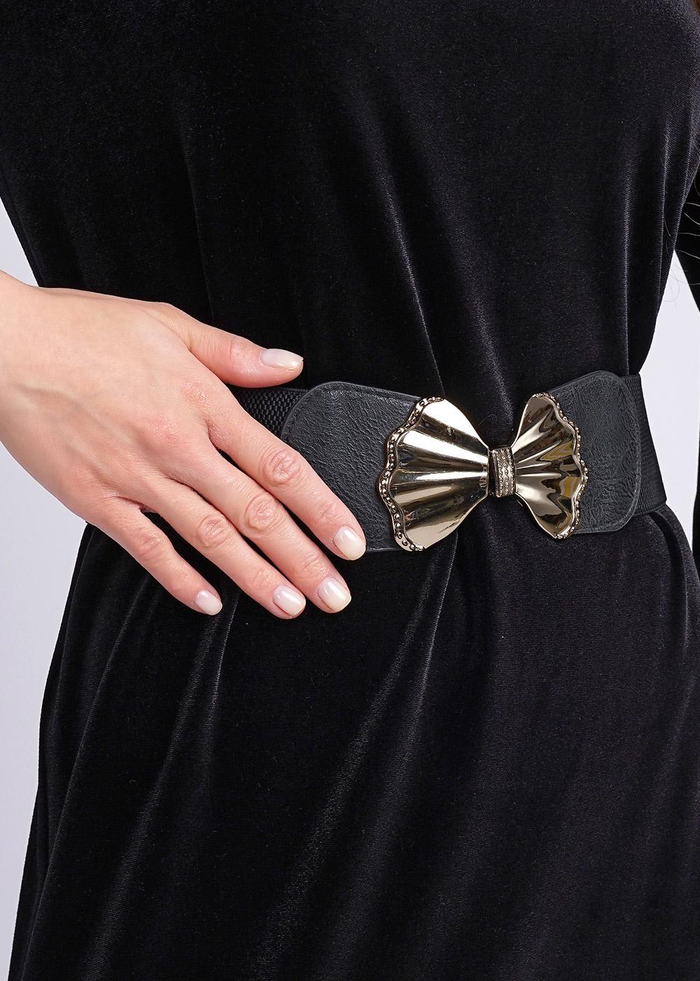 Ремень резинка шириной 6см с пряжкой из металла в виде банта. Длина ремня 69 см (в застёгнутом виде).