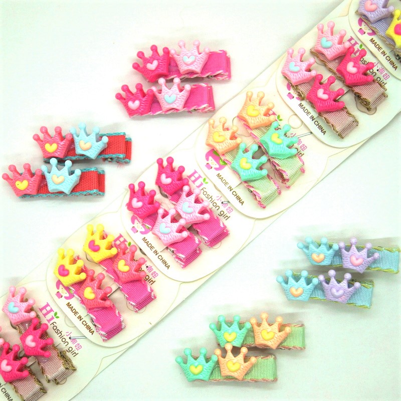 Симпатичные аксессуары изготовлены в виде металлических зажимов, декорированных тканью. Каждая заколка украшена двумя объемными фигурками в виде корон.