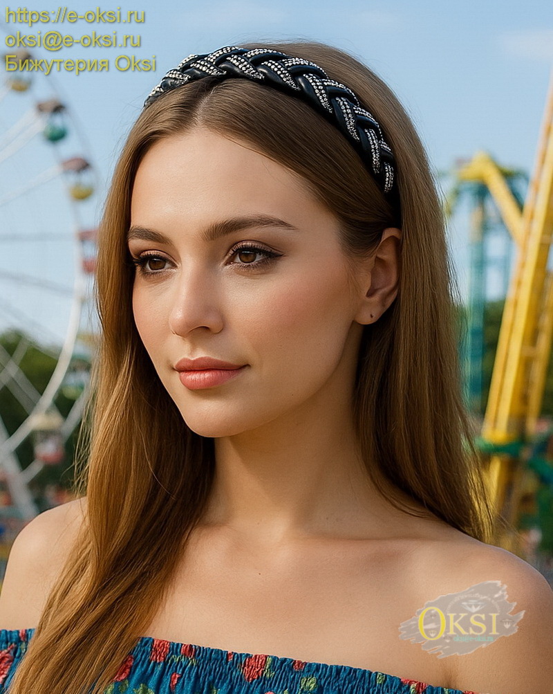Стильный ободок из черной экокожи с вплетением сверкающих кристаллов. Универсальный чёрный цвет подойдет к основным оттенкам одежды. Обязательно пригодится на каждый день или вечер, разбавив любой скучный наряд. Лёгкий, удобный и комфортный, не жмёт и не давит голову.