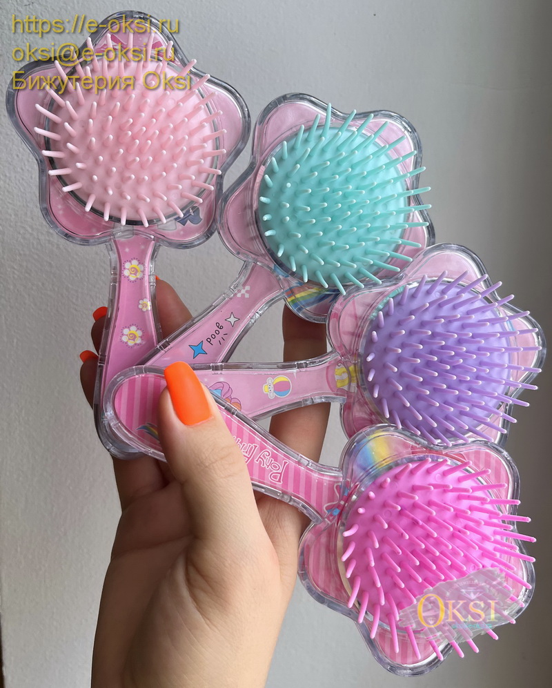 Яркая, красивая и необычная расческа-шейкер напоминающая погремушку. На внешней стороне, внутри расчески находится ''пересыпашка'' из блесток различных форм. Цена за 1 шт