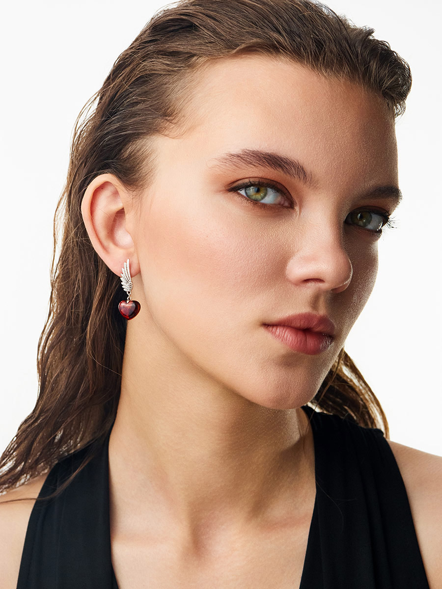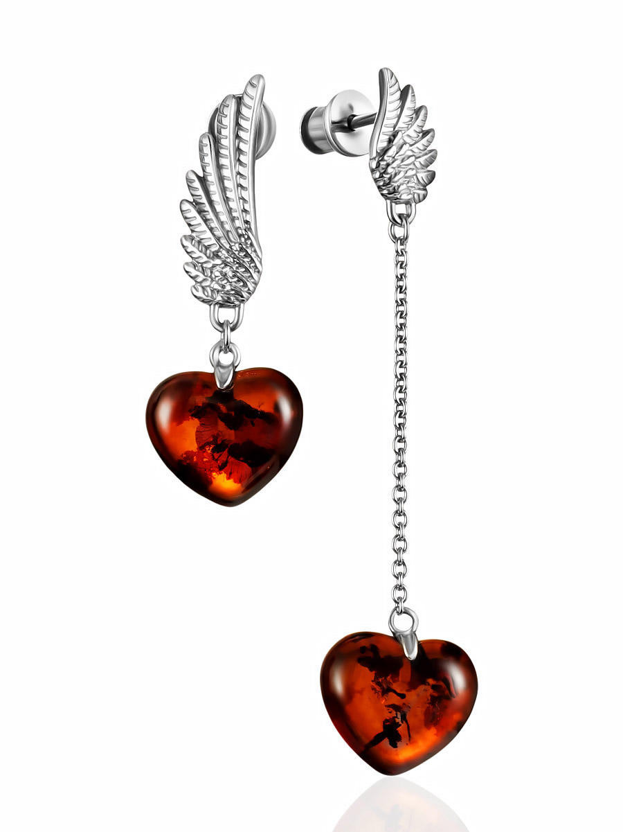 Асимметричные серьги с янтарными сердечками на застёжках-гвоздиках «Сердце»