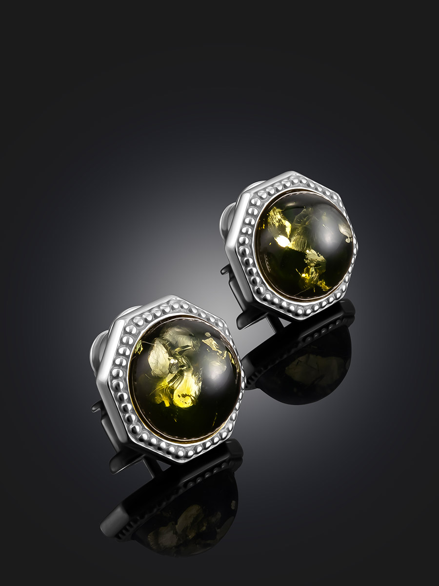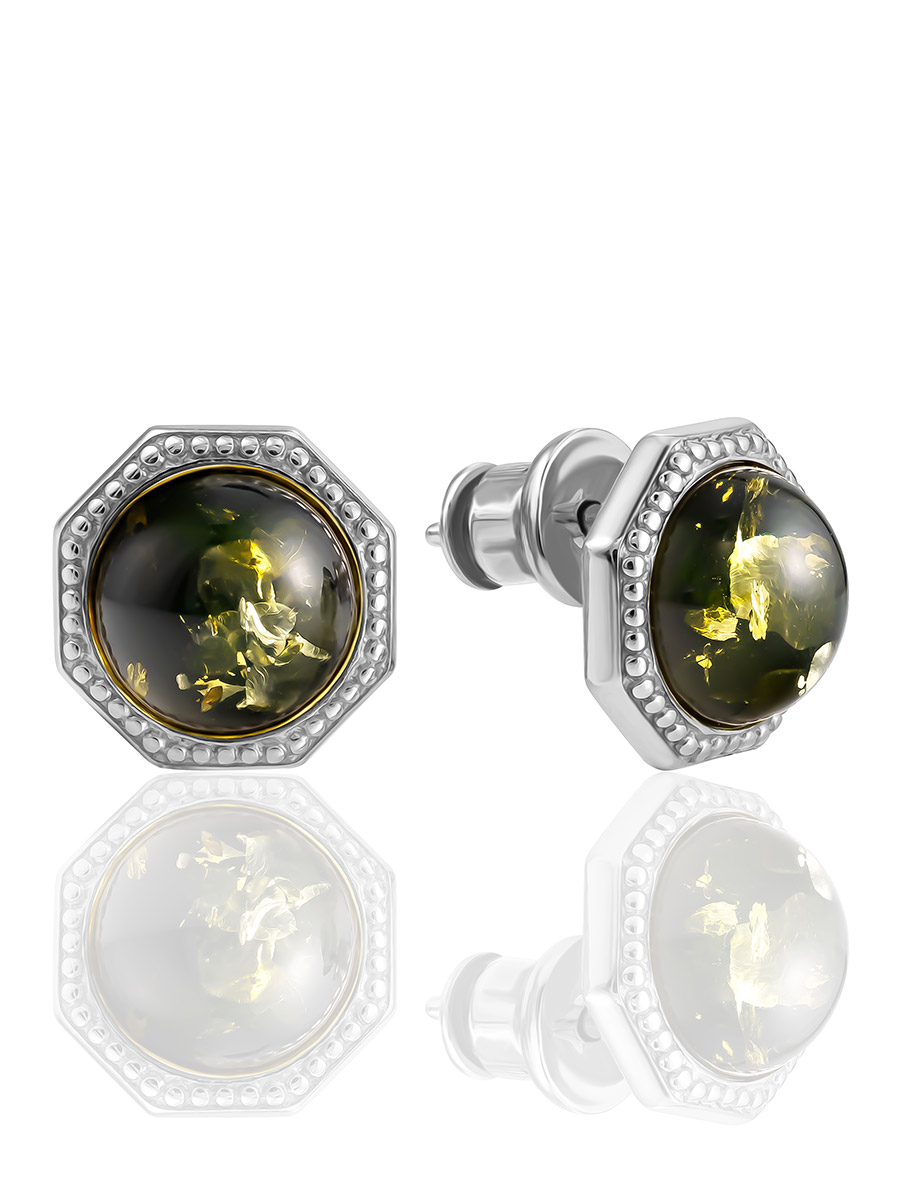 Ажурные серьги-гвоздики с тёмно-зелёным янтарём «Шахерезада»
