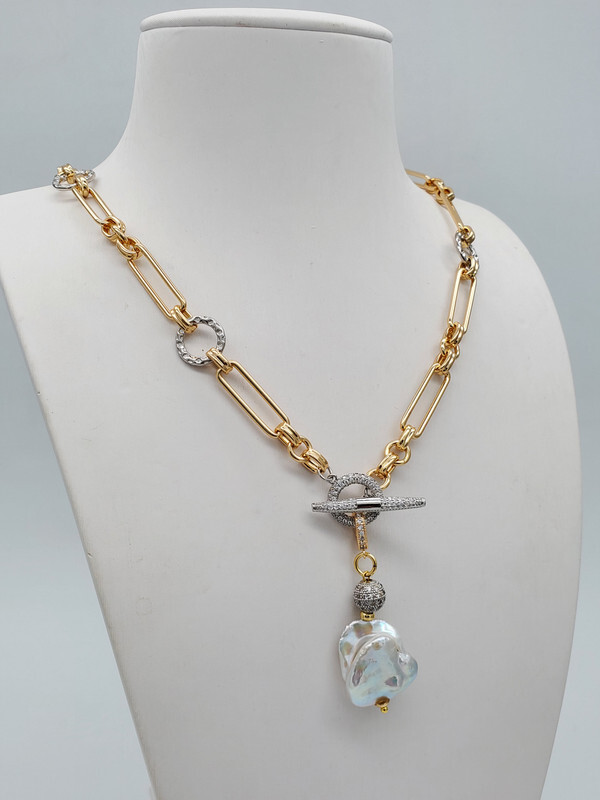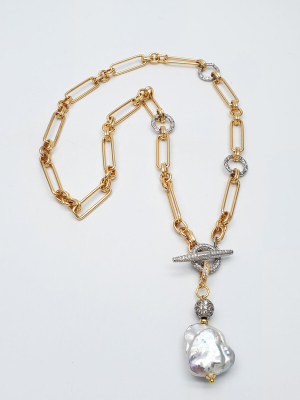 Размер: Длина колье 50 см, ширина 8 мм. Длина кулона 6,5 см. ширина 17 мм. Барочный жемчуг 17*20 мм.