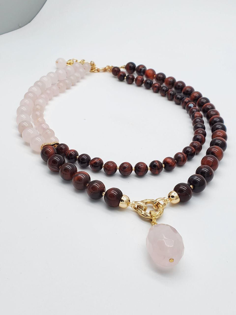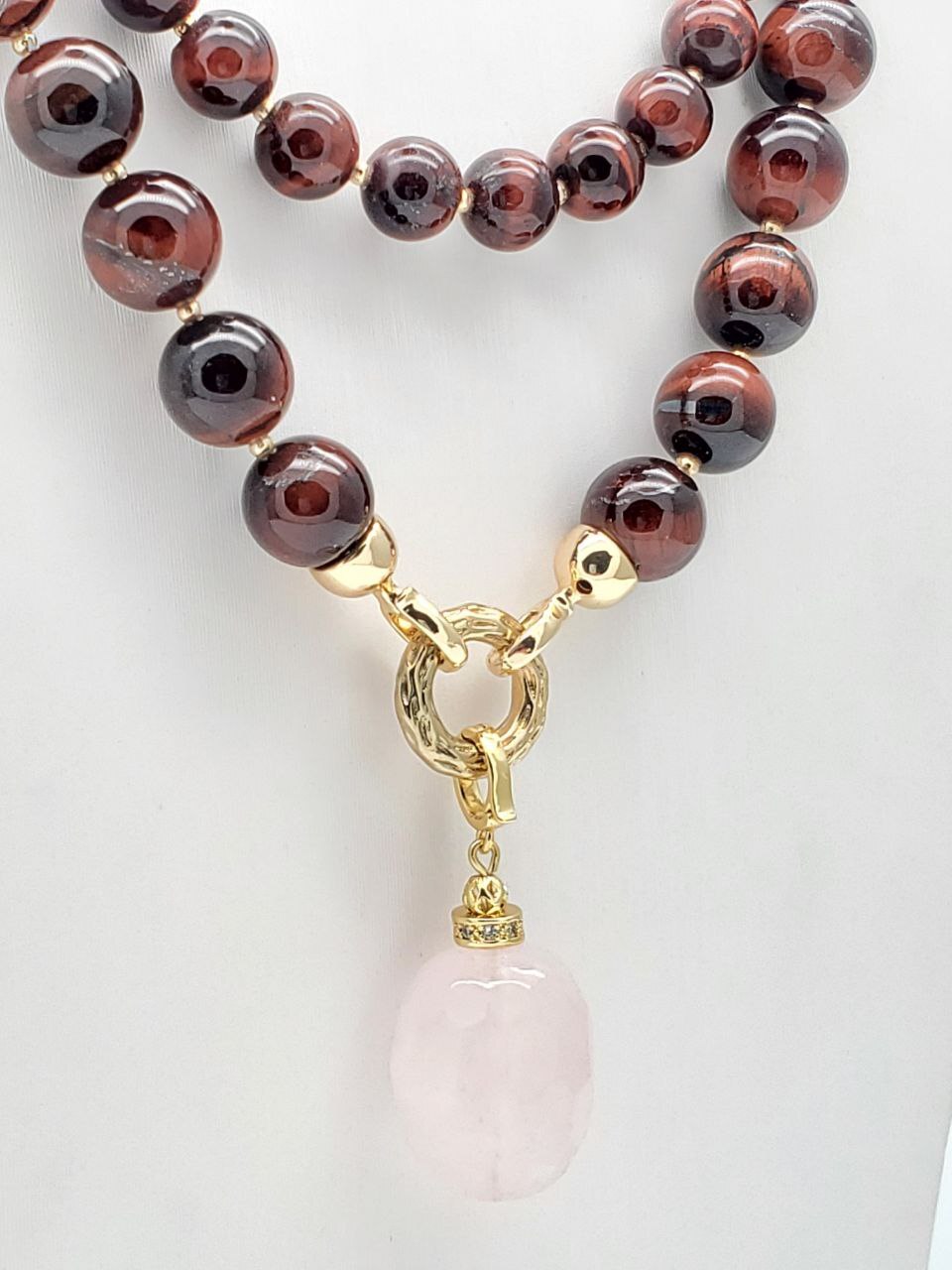 Размер: Длина колье 46 - 54 см, ширина 1,8 см. Кулон 5*1,6 см, розовый кварц 8-10 мм, бычий глаз 8-10 мм. галтовка розовый кварц 16*22 мм.