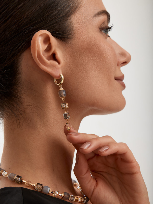 Хрустальное стекло, цирконы, дымчатый кварц, гематит, ювелирный сплав. Гальваническое покрытие: золото.