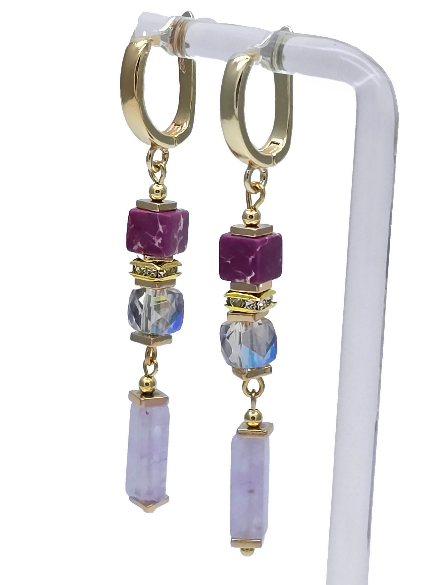 Агат лавандовый, хрусталь, варисцит, гематит, стразы, ювелирный сплав. Гальваническое покрытие: золото.