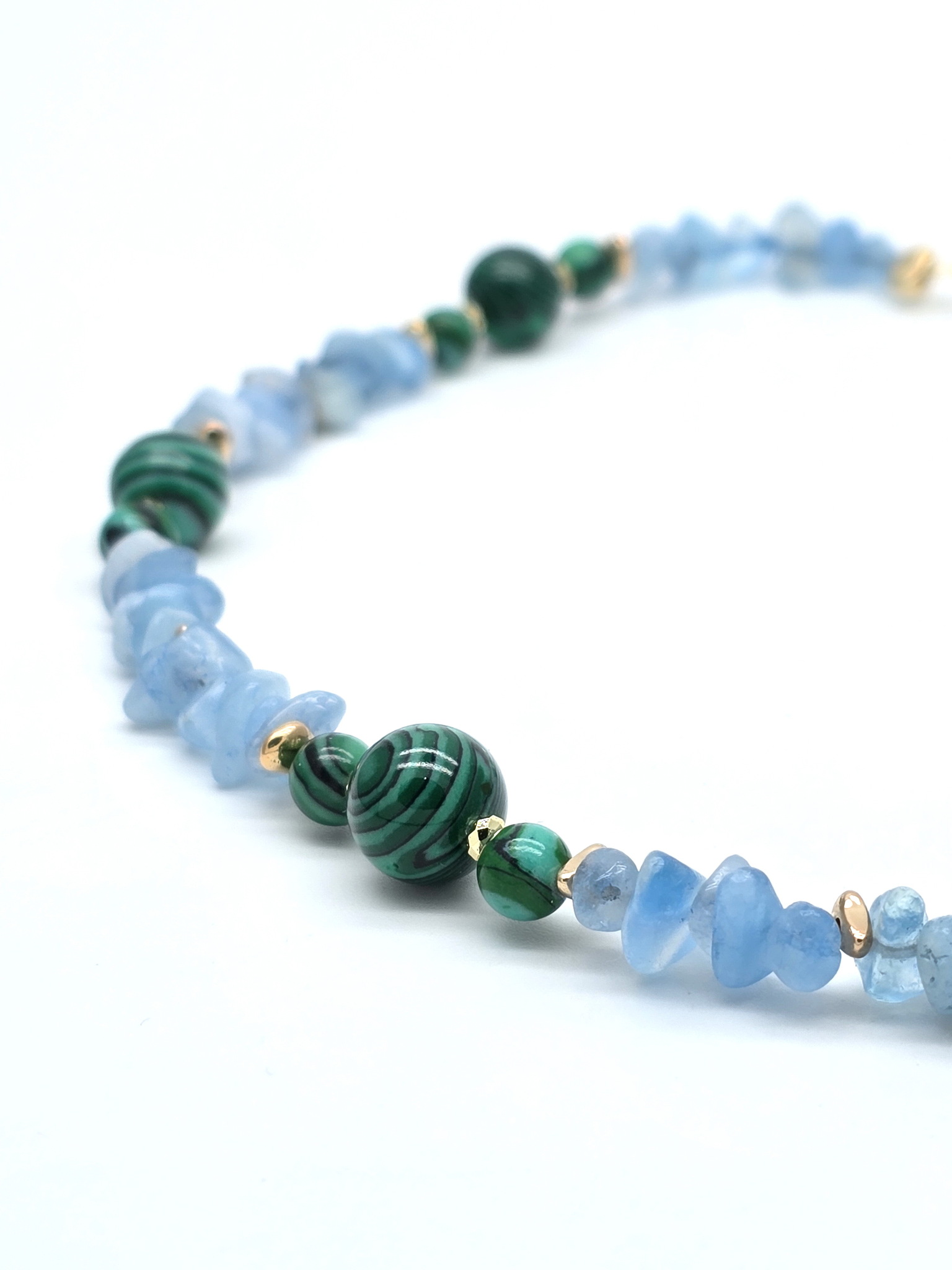 Аквамарин, малахит искусственный, гематит, ювелирный сплав. Гальваническое покрытие: золото.
