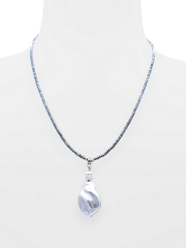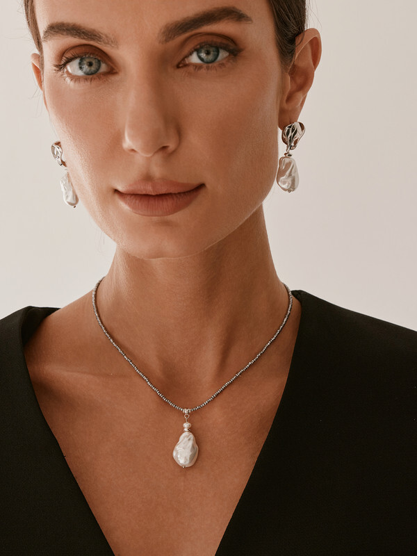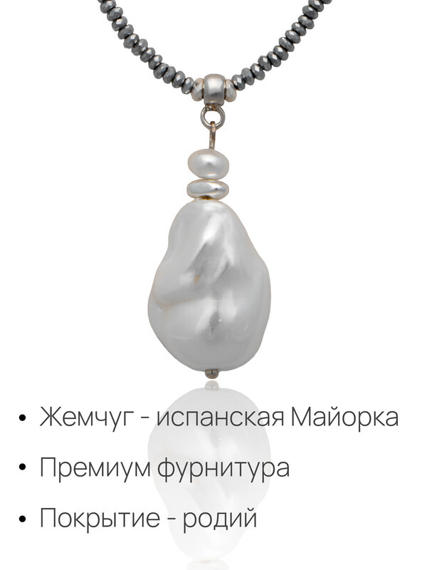 Гематит, жемчуг Майорка барочный, циркон, ювелирный сплав. Гальваническое покрытие: родий.