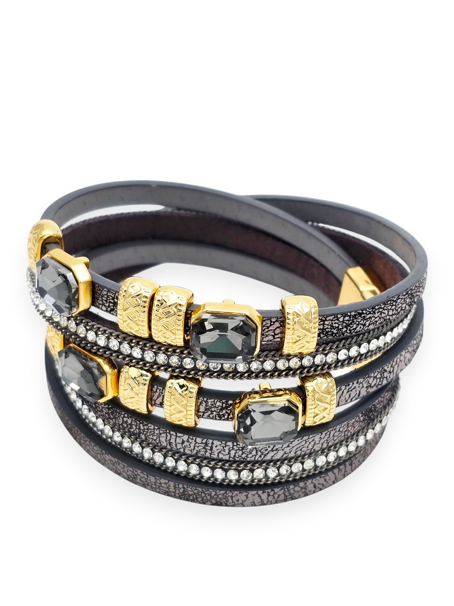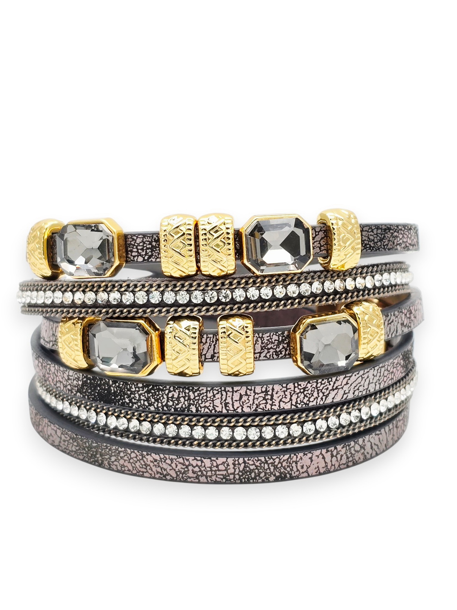 Искусственная кожа, хрустальное стекло, ювелирный сплав. Гальваническое покрытие: золото.