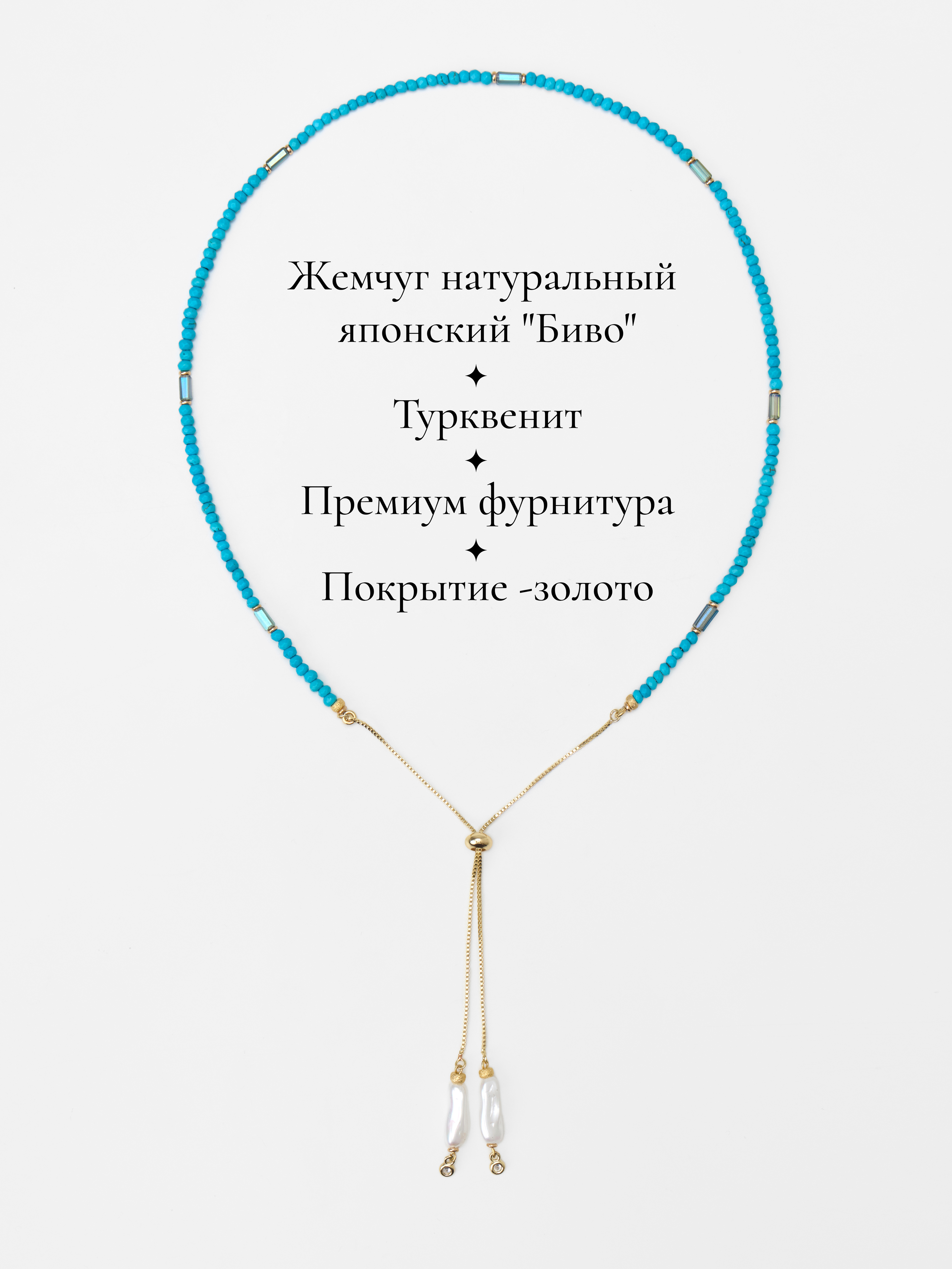 Размер: Длина колье 68 см. Японский жемчуг "Биво". 6*16 мм, турквенит 4 мм.