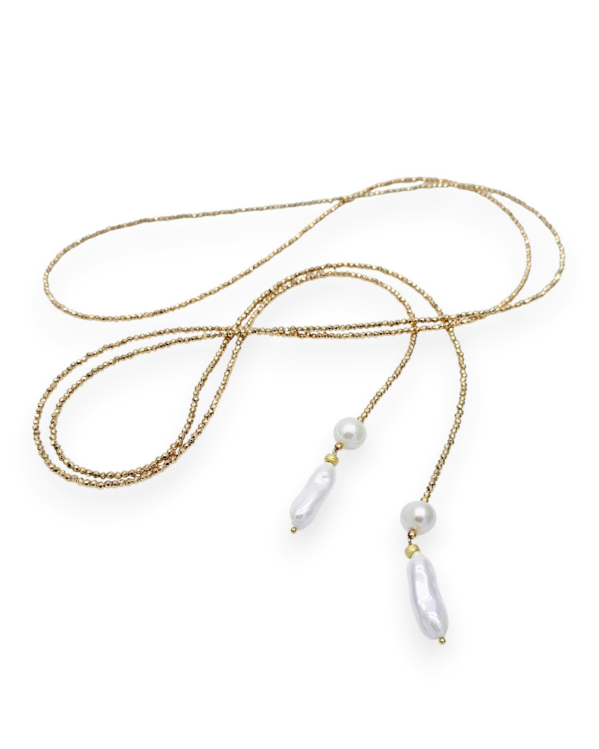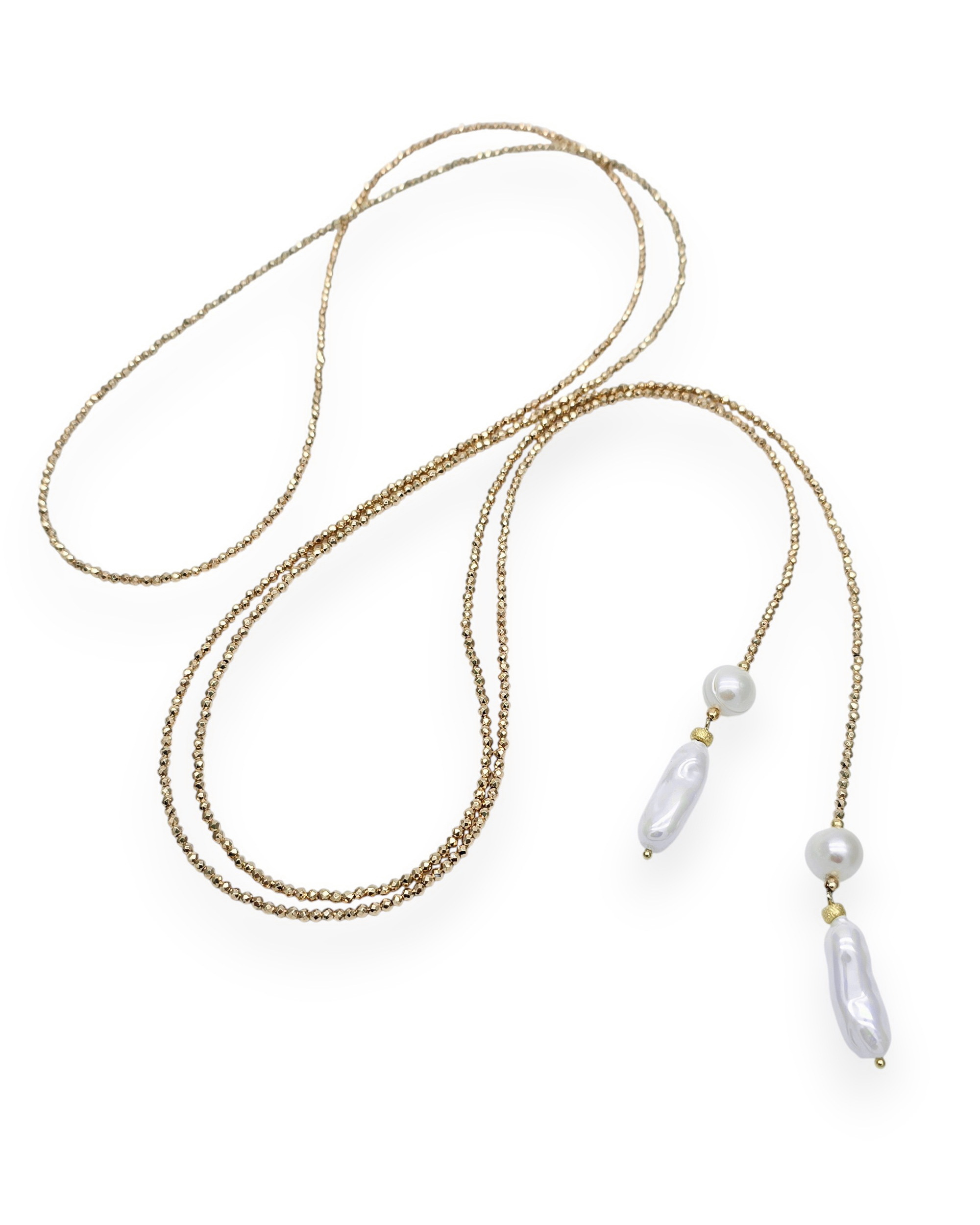 Размер: Длина колье 140 см. Жемчуг 9-10 мм, 8*20 мм, марказит 2 мм.