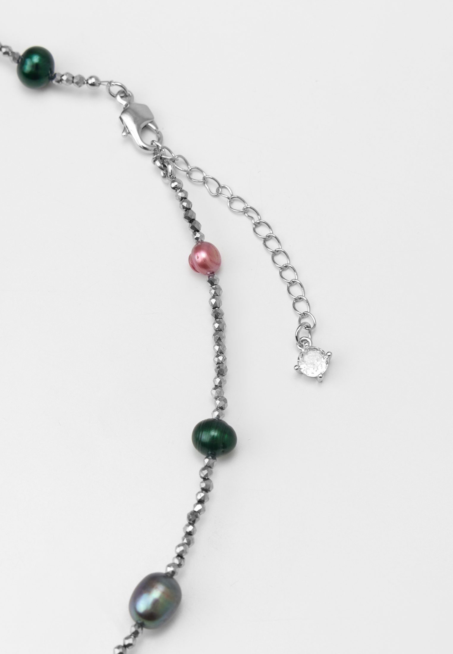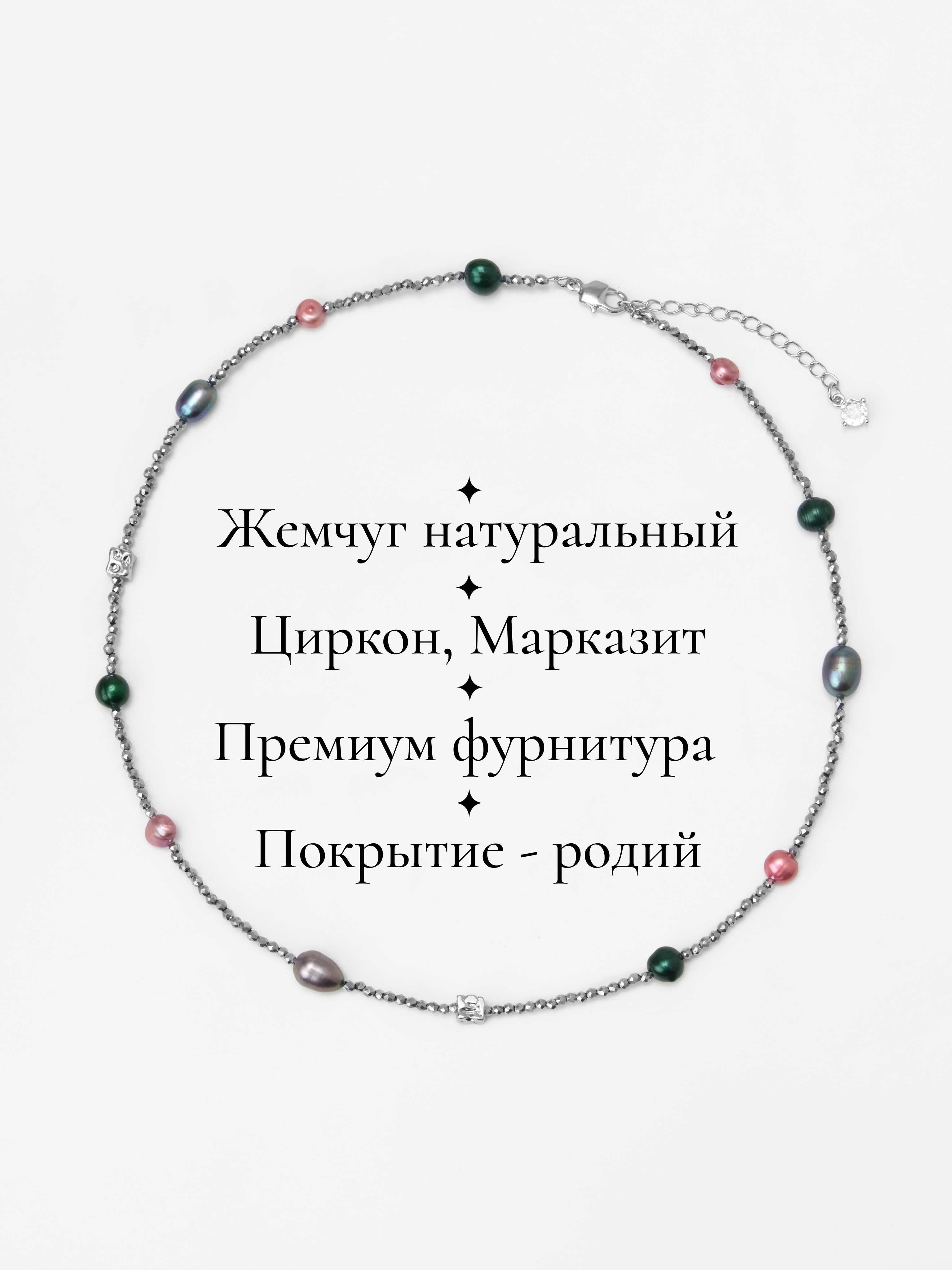 Размер: Длина колье 40 - 46 см. Жемчуг зеленый 6 мм, розовый 5*6 мм, серый 7*10 мм, марказит 2 мм.