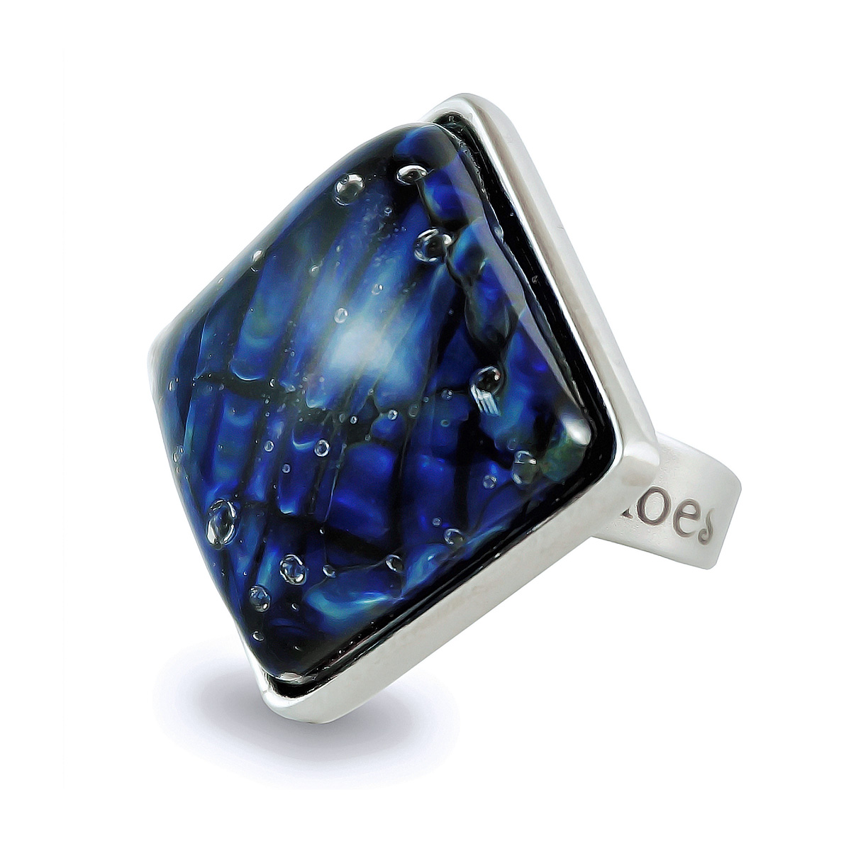 Кольцо изготовлено из муранского стекла и гипоаллергенной ювелирной стали, что очень важно для людей с чувствительной кожей. Металл не темнеет и не подвергается воздействиям окружающей среды, надолго обеспечивая красивый внешний вид изделия.  Размер 3x3 см. Кольцо безразмерное, регулируется с 16 до 19 размера. Вес  - 15 гр.