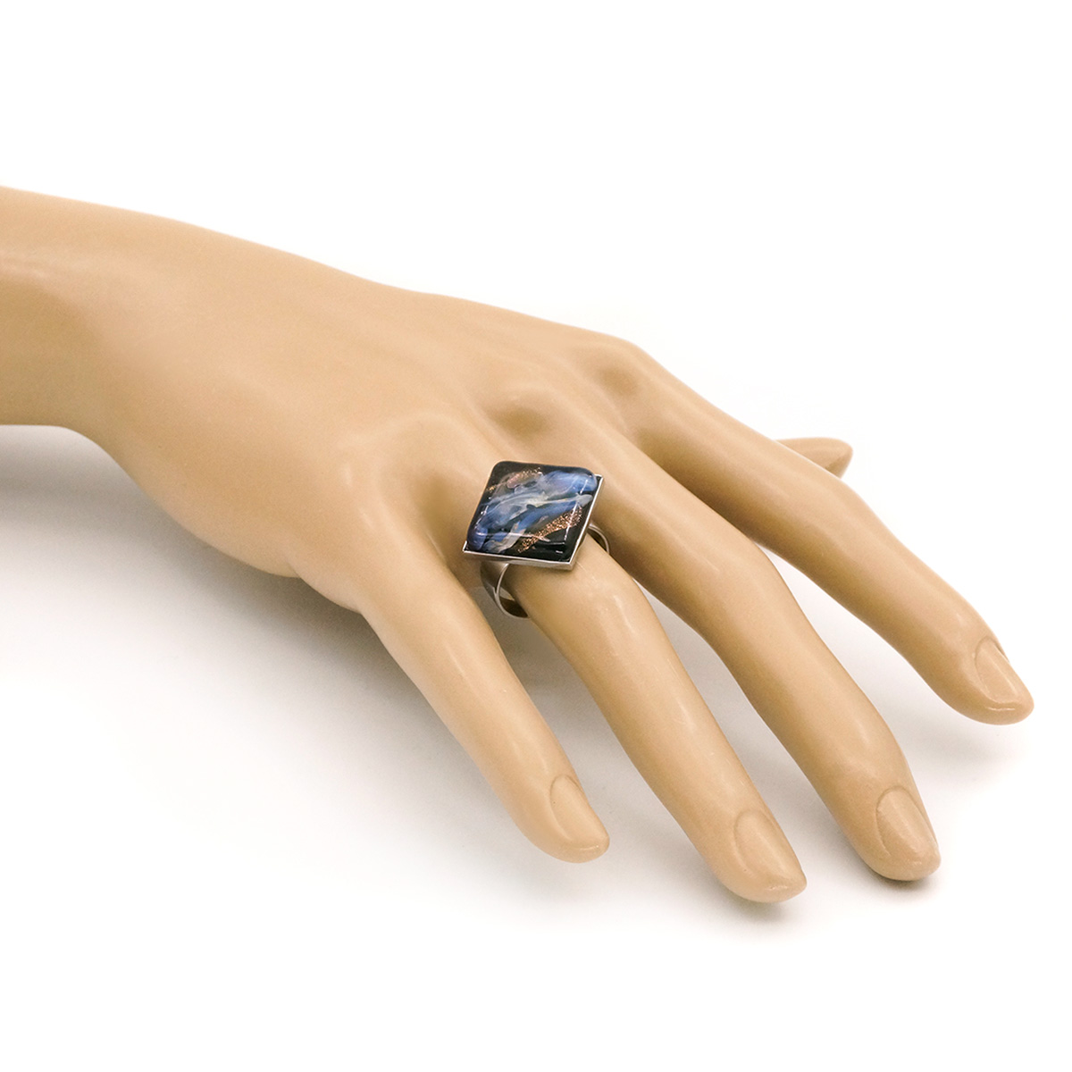 Кольцо изготовлено из муранского стекла и гипоаллергенной ювелирной стали, что очень важно для людей с чувствительной кожей. Металл не темнеет и не подвергается воздействиям окружающей среды, надолго обеспечивая красивый внешний вид изделия. Размер стеклянного элемента - 2,3x2,3 см. Кольцо безразмерное, регулируется с 16 до 19 размера. Вес - 5 гр.