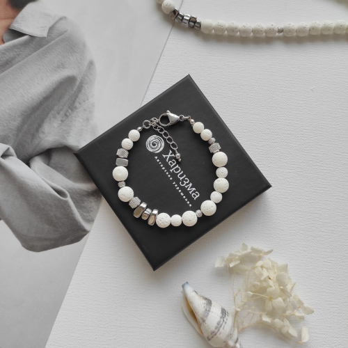 Браслет из белого вулканита, серебристого гематита