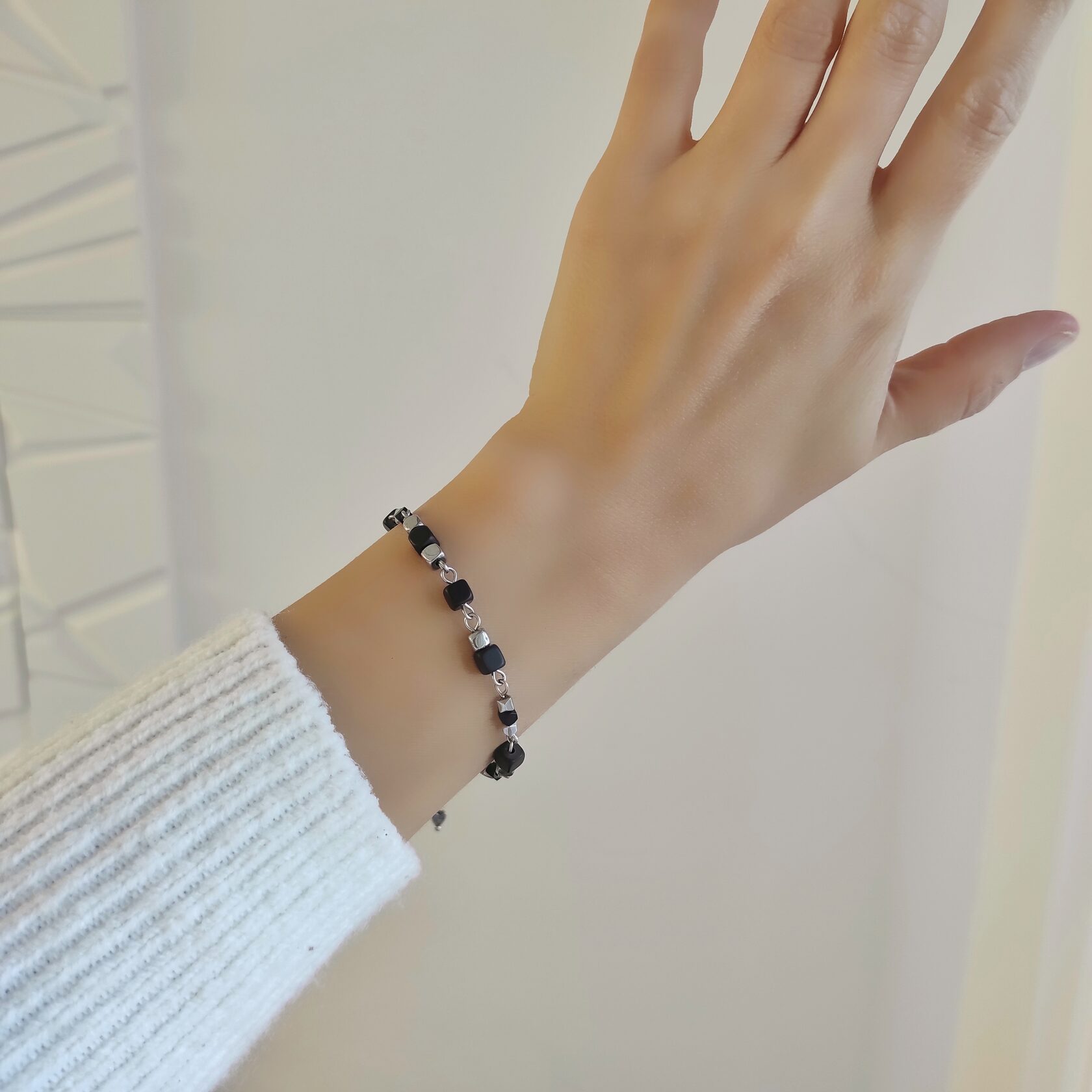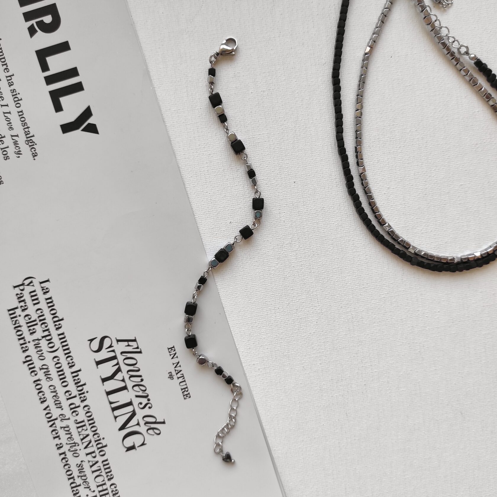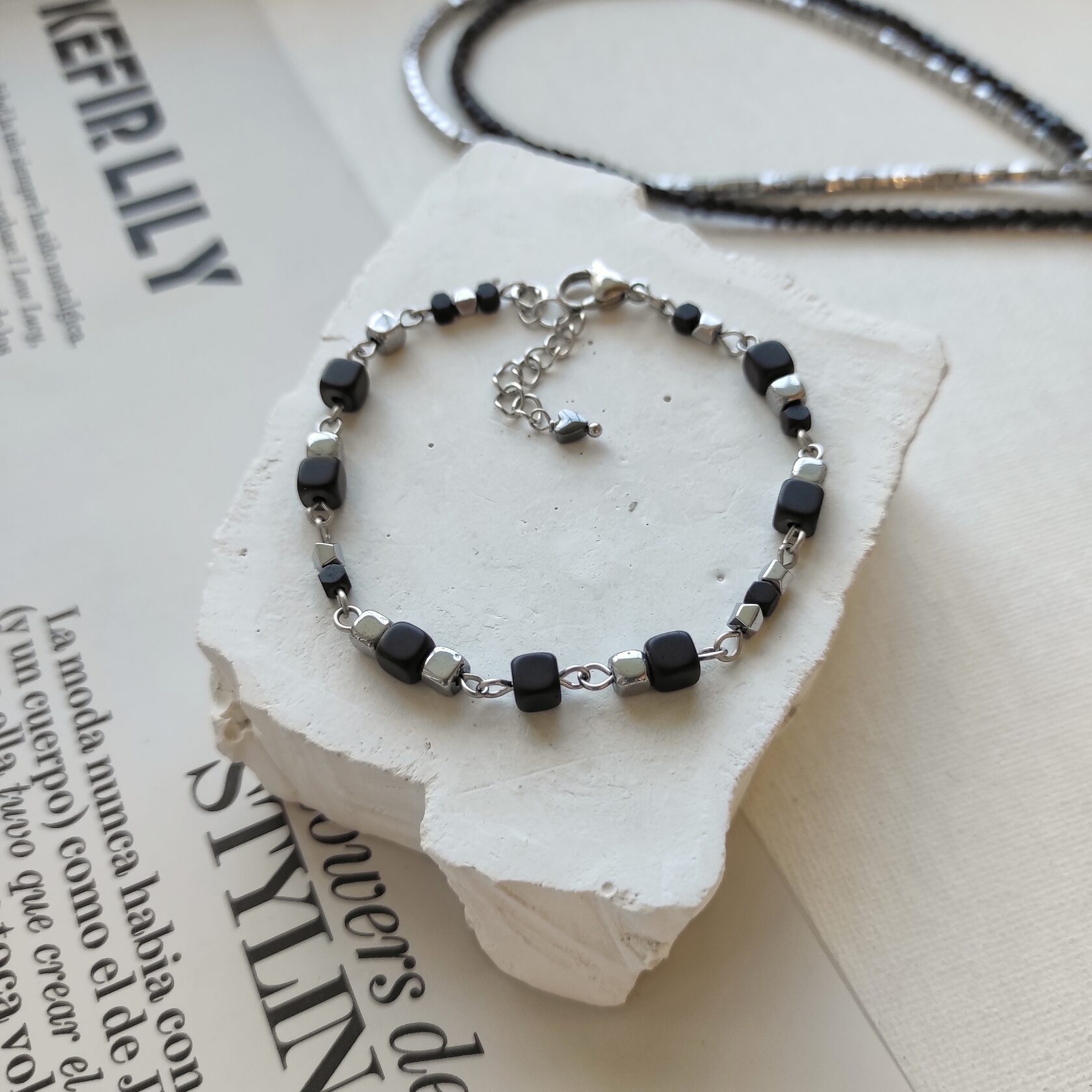 Браслет из гематита: матовый чёрный гематит + серебристый