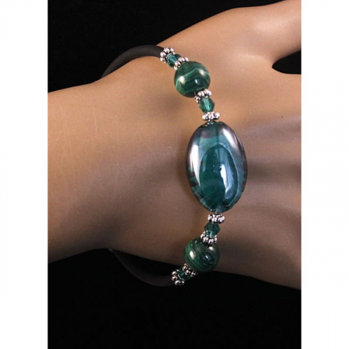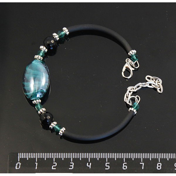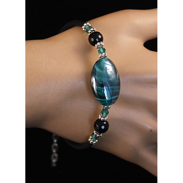 Браслет на струнке из агата черного (огранка) и зеленого муранского стекла