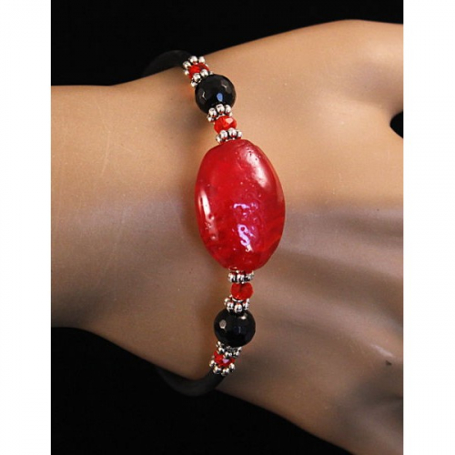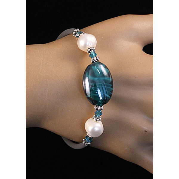 Браслет на струнке из жемчуга белого и зеленого муранского стекла