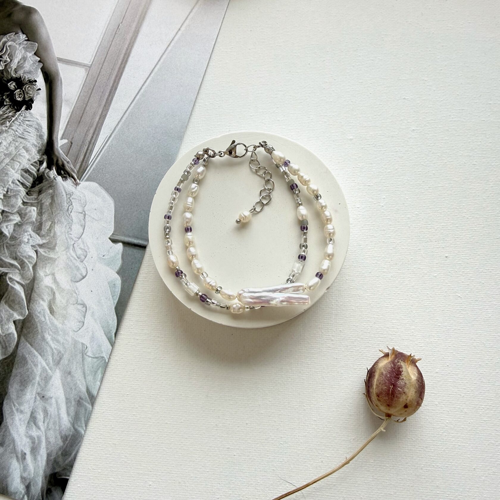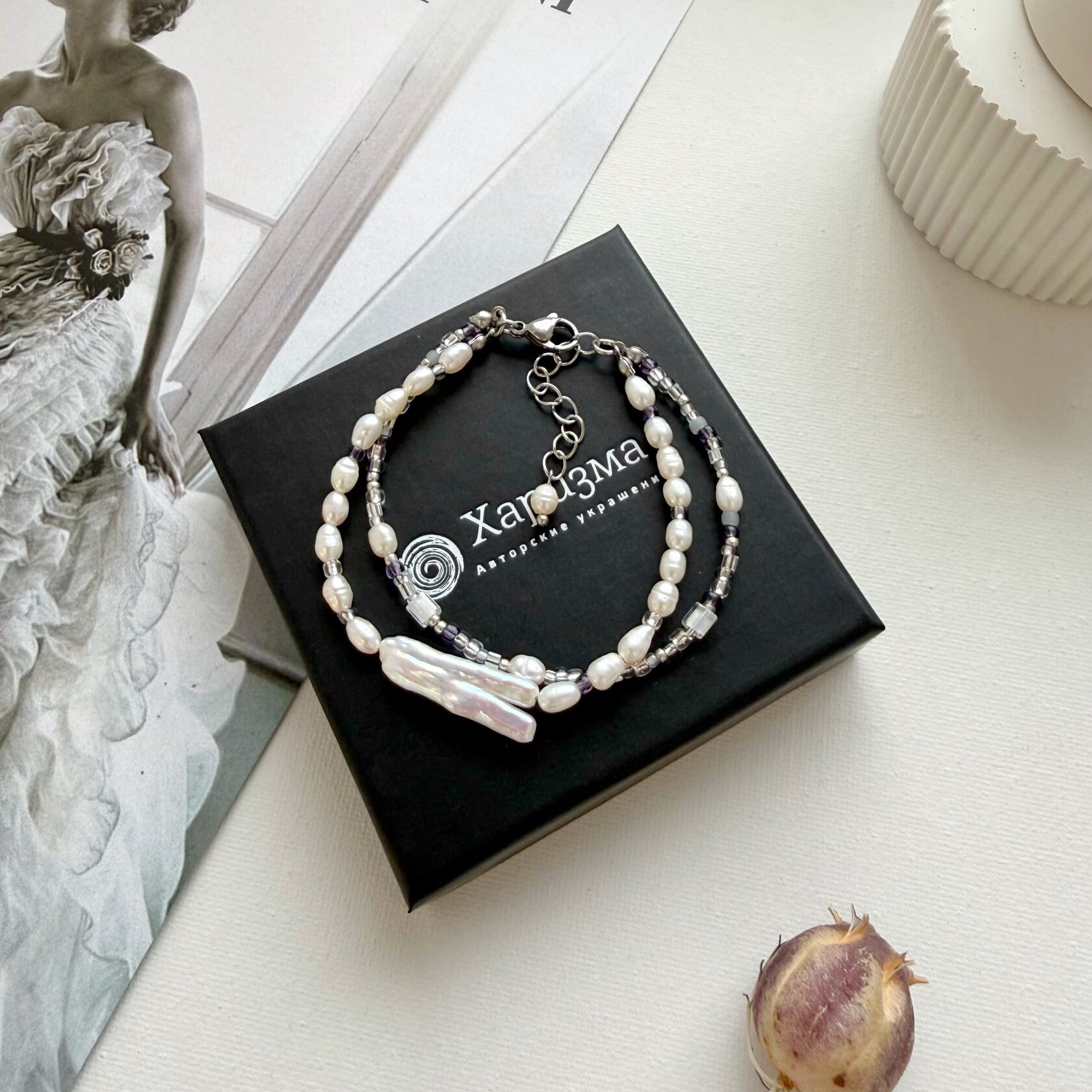 Браслет в 2 слоя: барочный жемчуг + жемчуг рис
