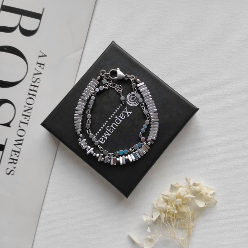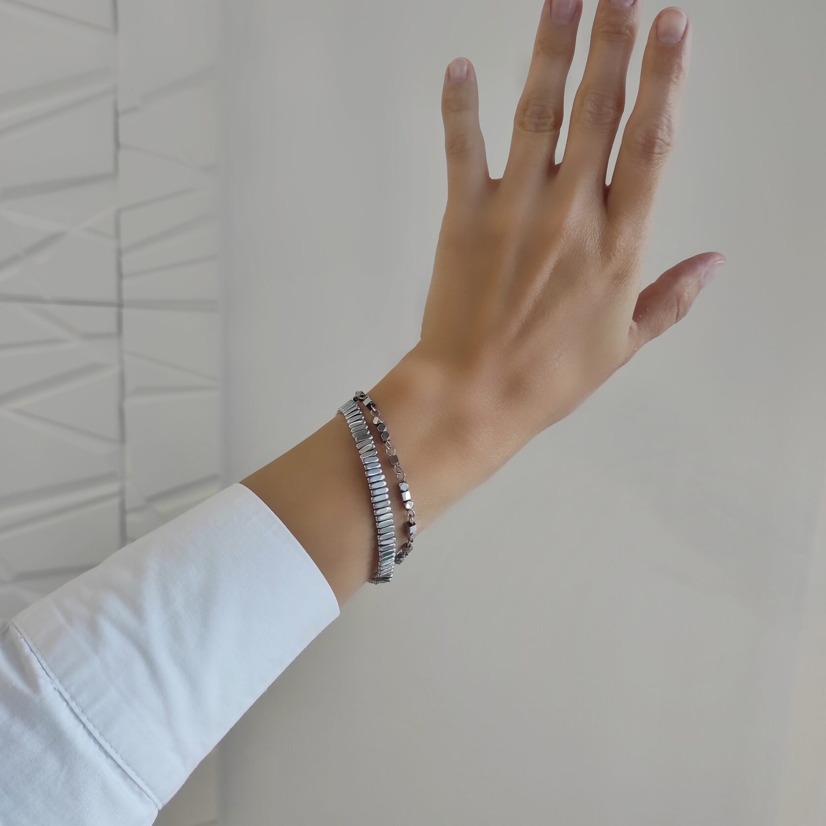 Браслет в 2 слоя из натурального гематита с серебристым покрытием.