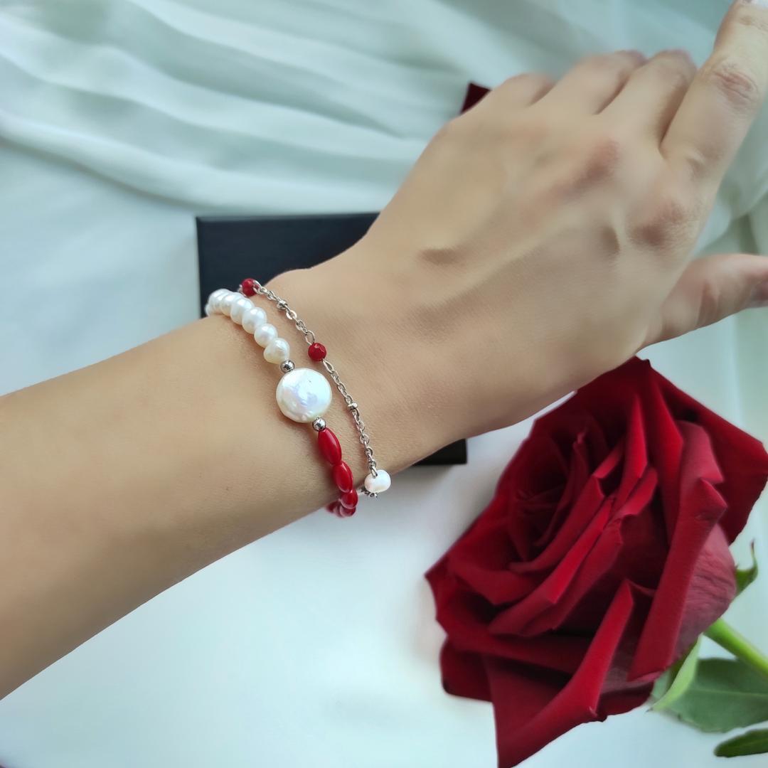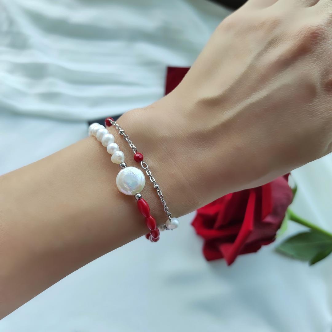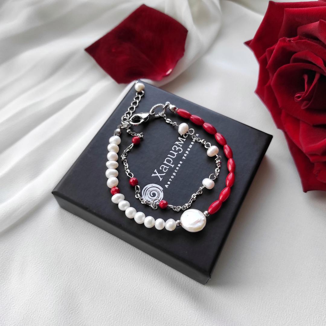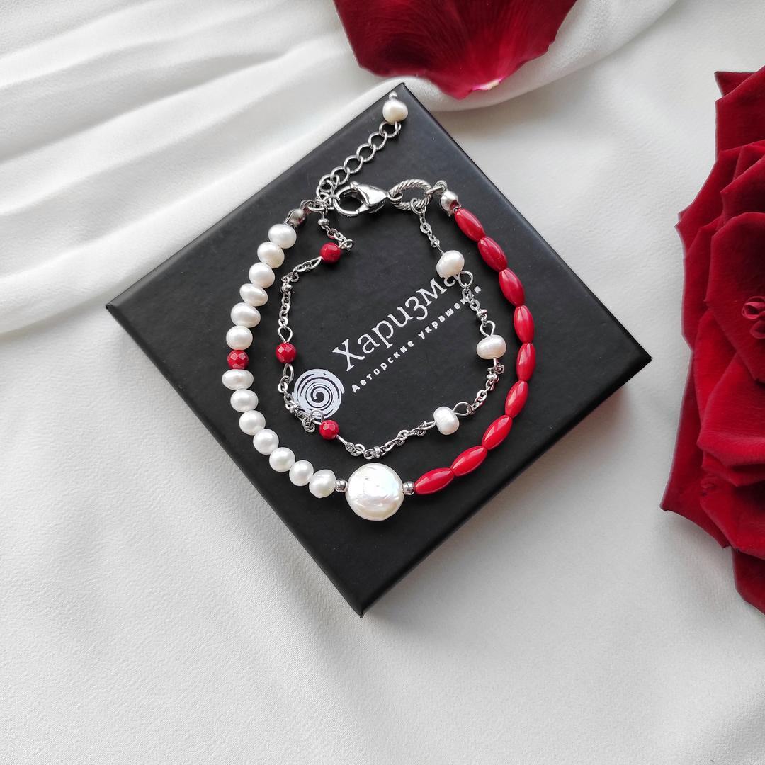 Браслет в 2 слоя. Красный коралл. Натуральный культивированный жемчуг ~5мм. В центре - барочная жемчужина округлой приплюснутой формы.