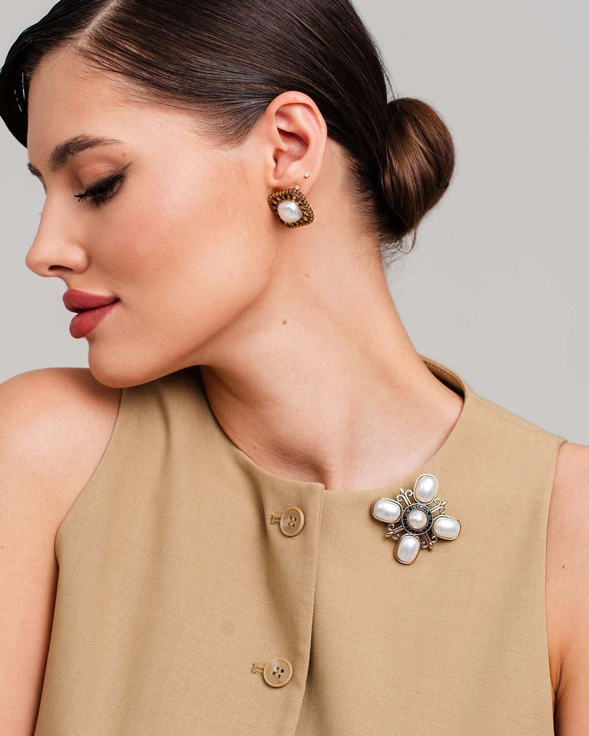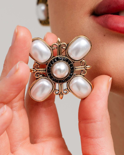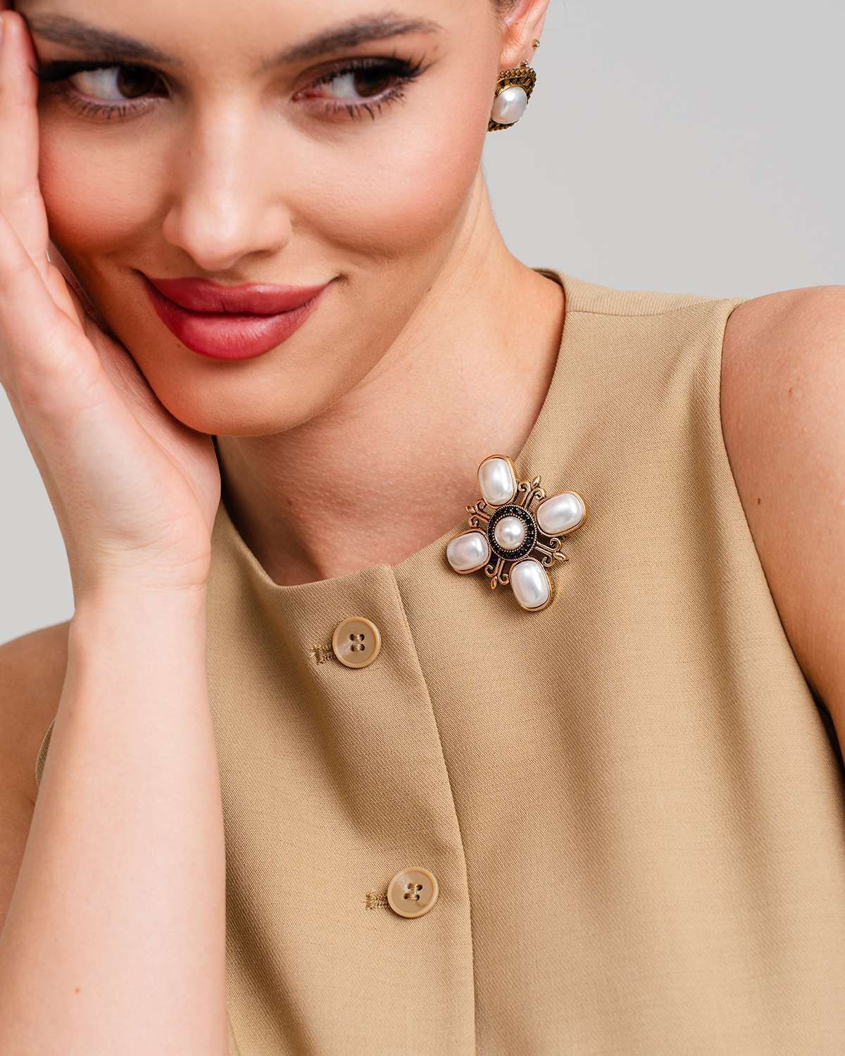 Брошь-крест с жемчугом – это одновременно и дань традициям, и современный акцент в вашем гардеробе. Винтажная брошь хранит в себе дух прошлых эпох, напоминая о балах и великосветских приемах. Брошь-булавка – практичное и стильное решение для фиксации шарфов, платков и лацканов пиджаков. Необычная брошь привлекает внимание своей оригинальностью и смелым дизайном. В центре броши расположена круглая жемчужина, окруженная черным кругом из страз. Это сочетание создает эффектный контраст и придает украшению загадочность и глубину.