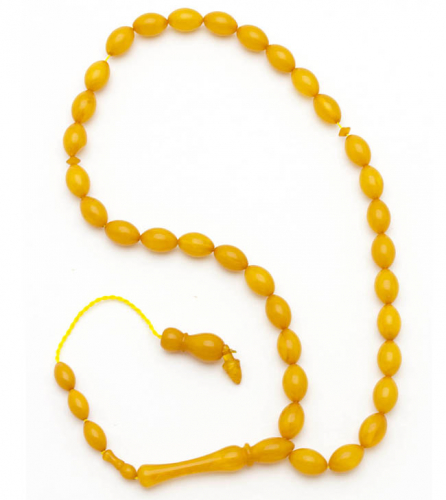 Четки 33 бусины из янтаря (искусственного). Бусины 8*16мм.