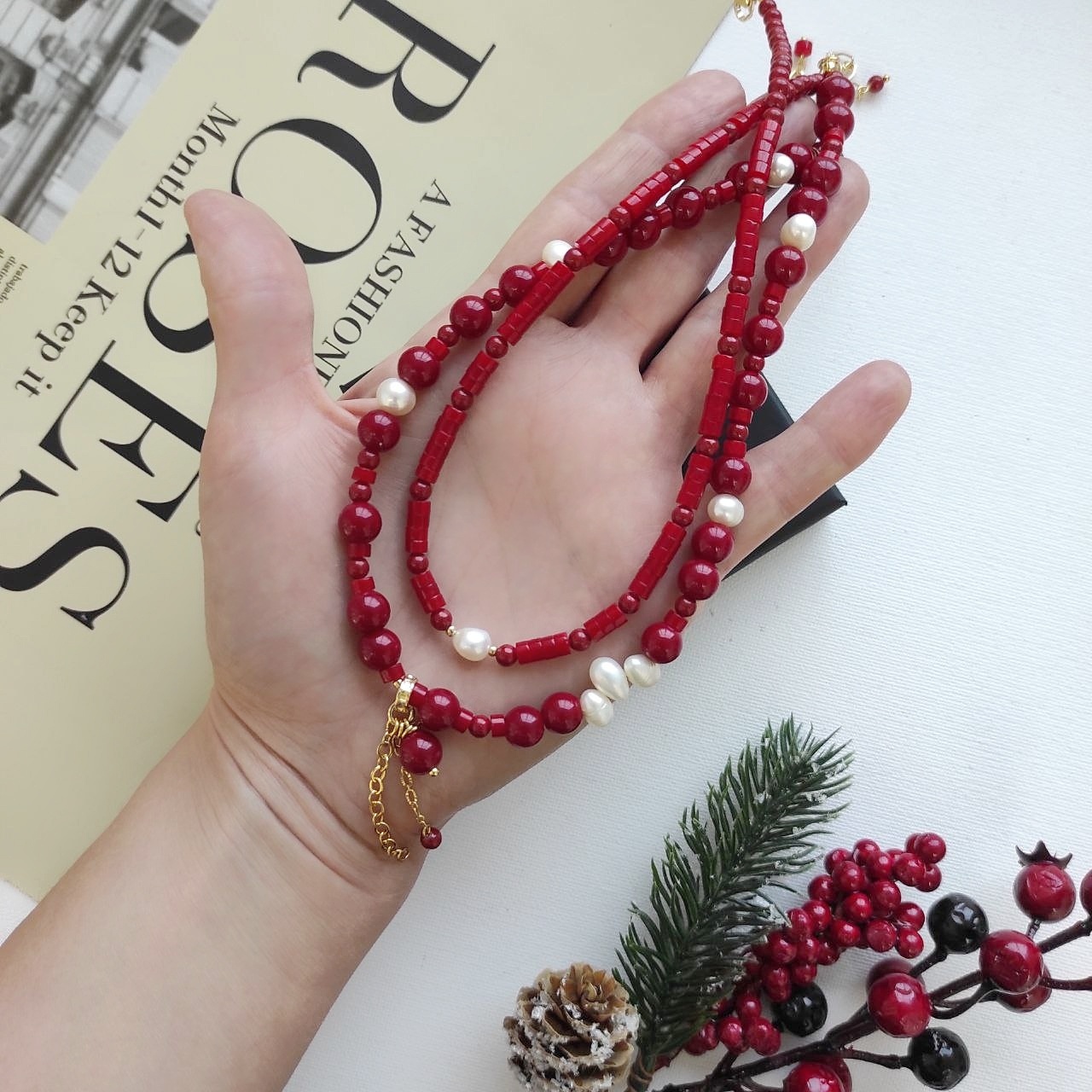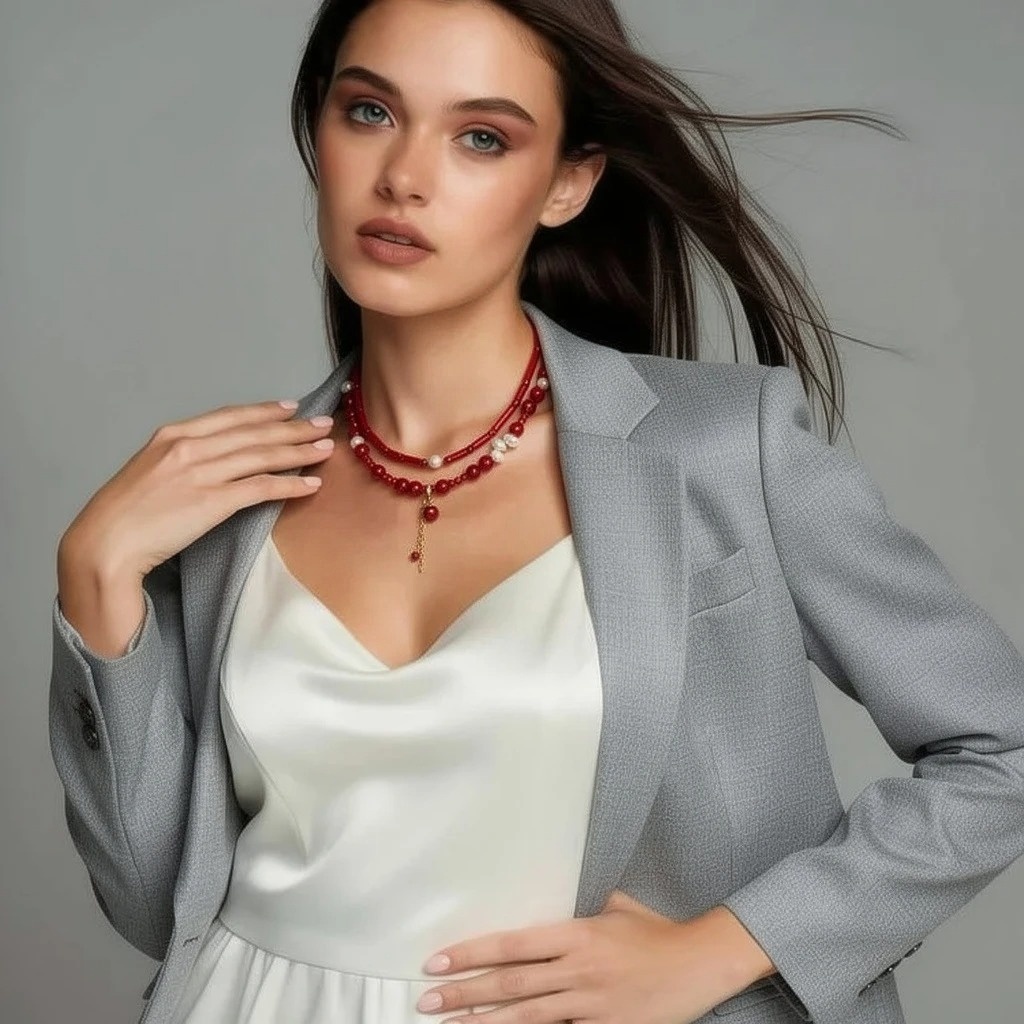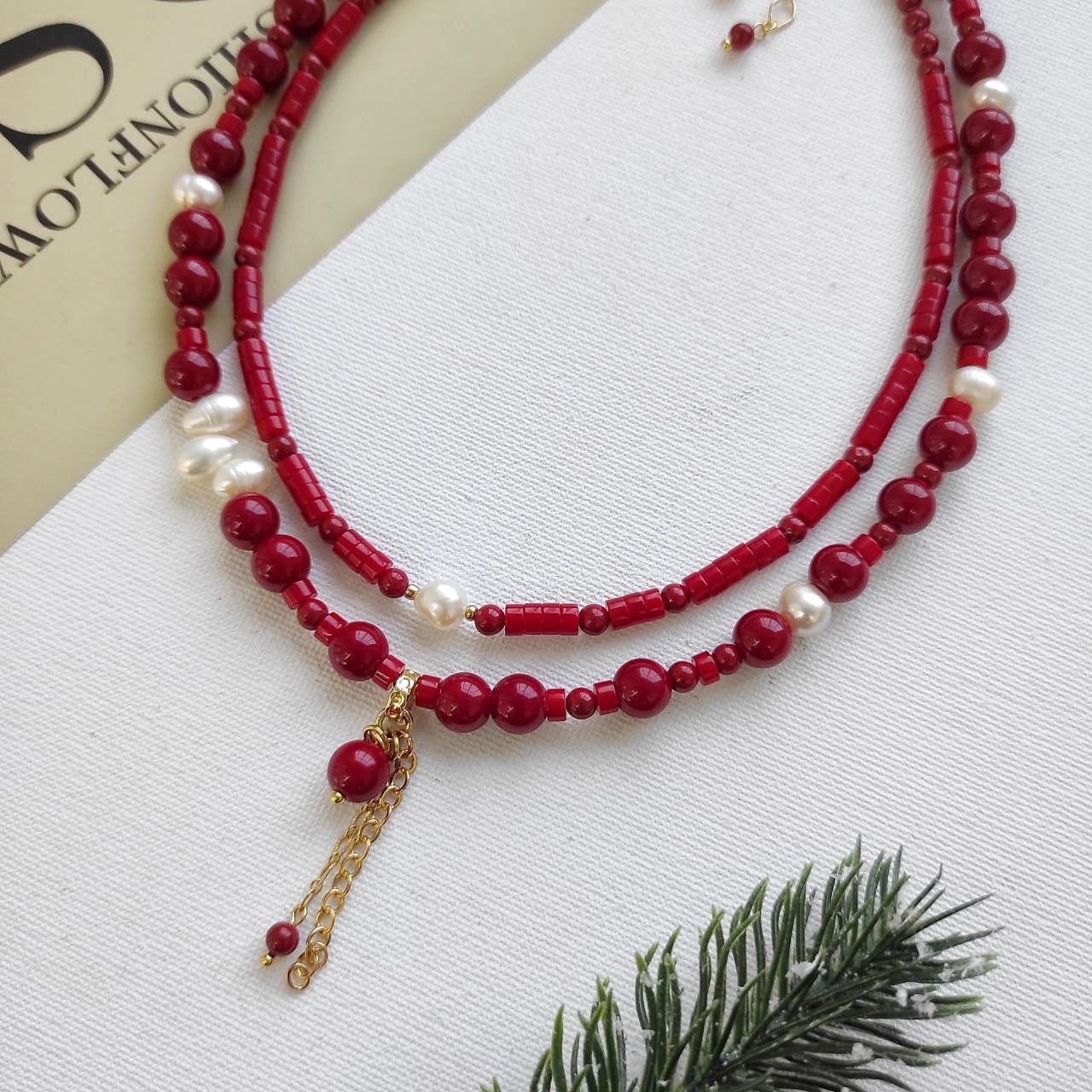 Чокер + колье красного цвета с натуральным жемчугом