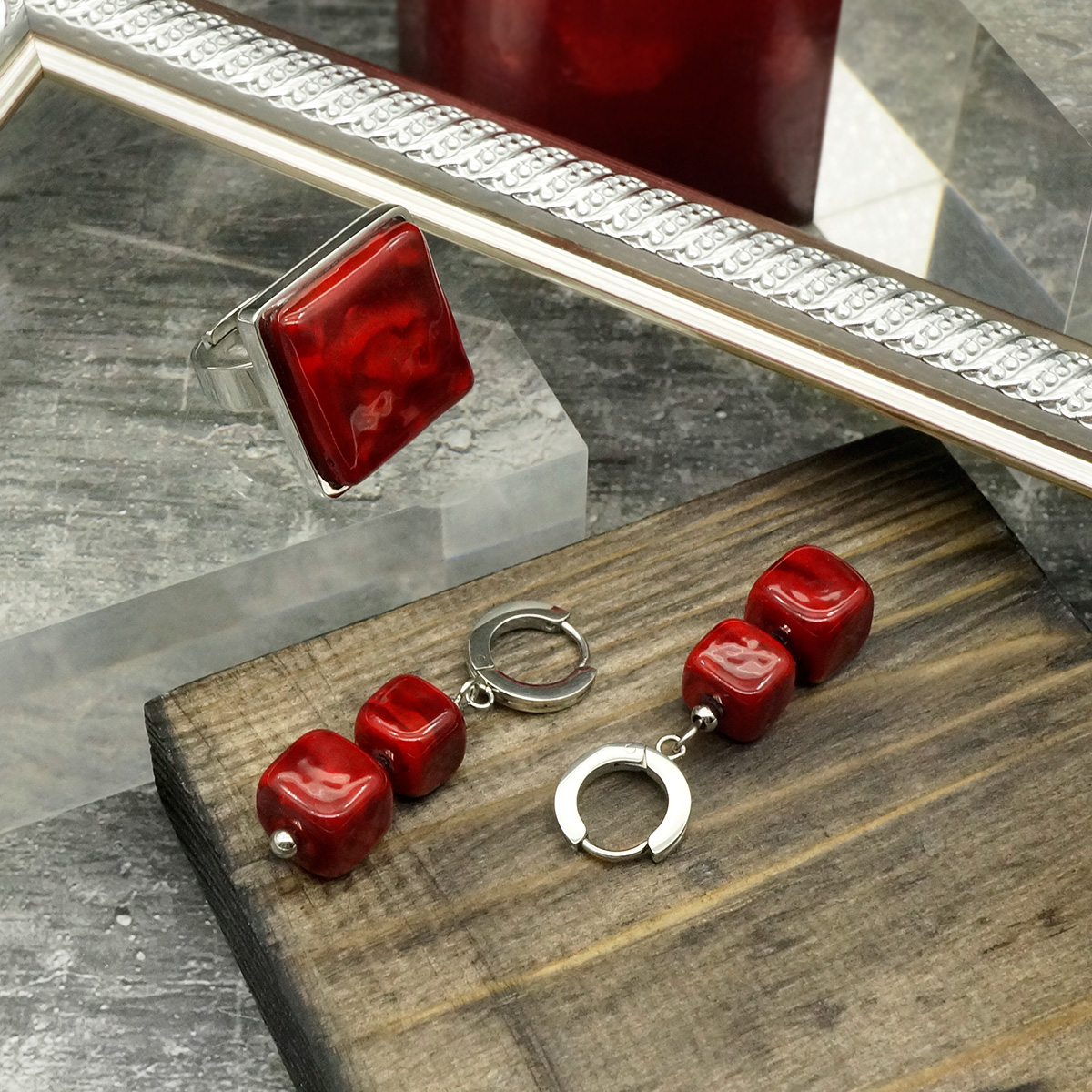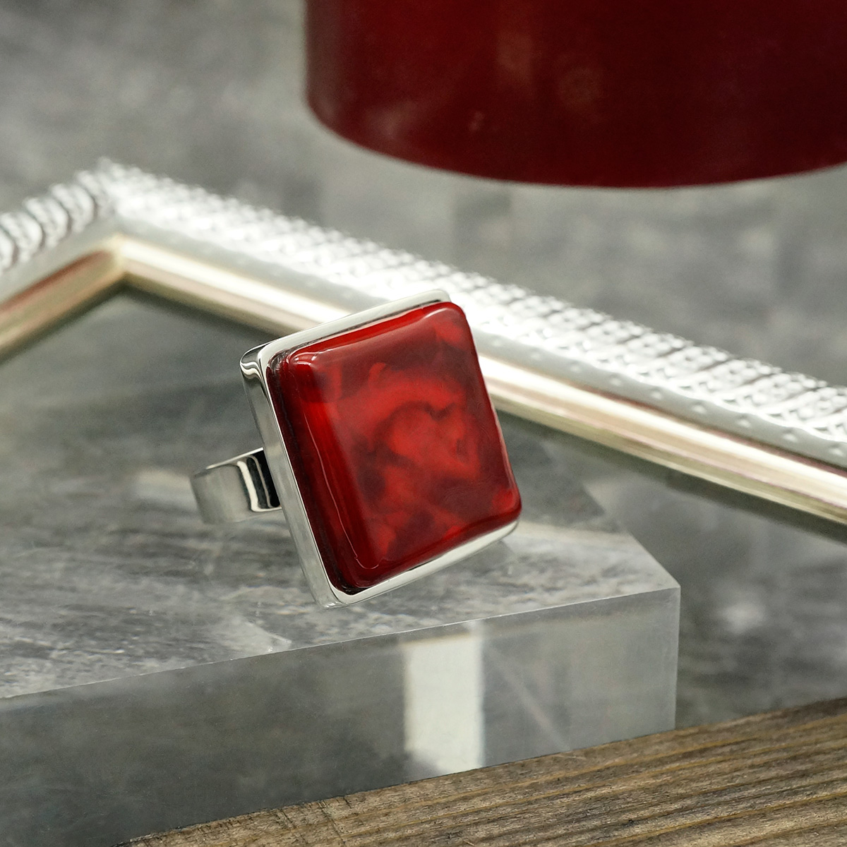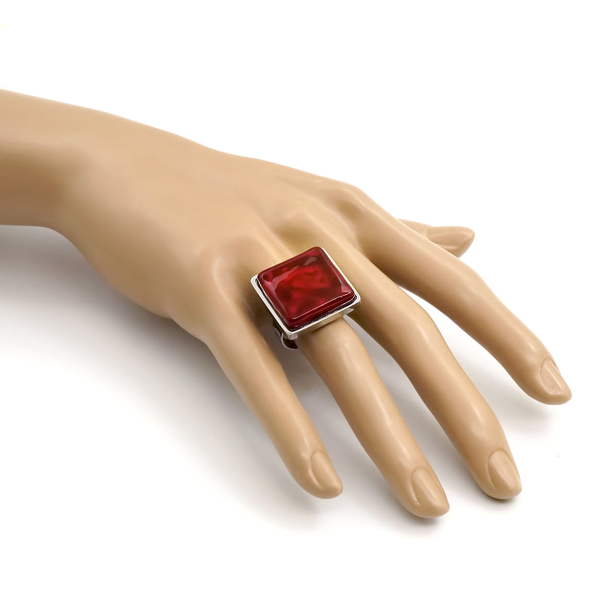 Кольцо изготовлено из муранского стекла и гипоаллергенной ювелирной стали, что очень важно для людей с чувствительной кожей. Металл не темнеет и не подвергается воздействиям окружающей среды, надолго обеспечивая красивый внешний вид изделия.  Размер стеклянного элемента - 2*2 см. Кольцо безразмерное, регулируется с 16 до 19 размера. Вес - 16 гр.