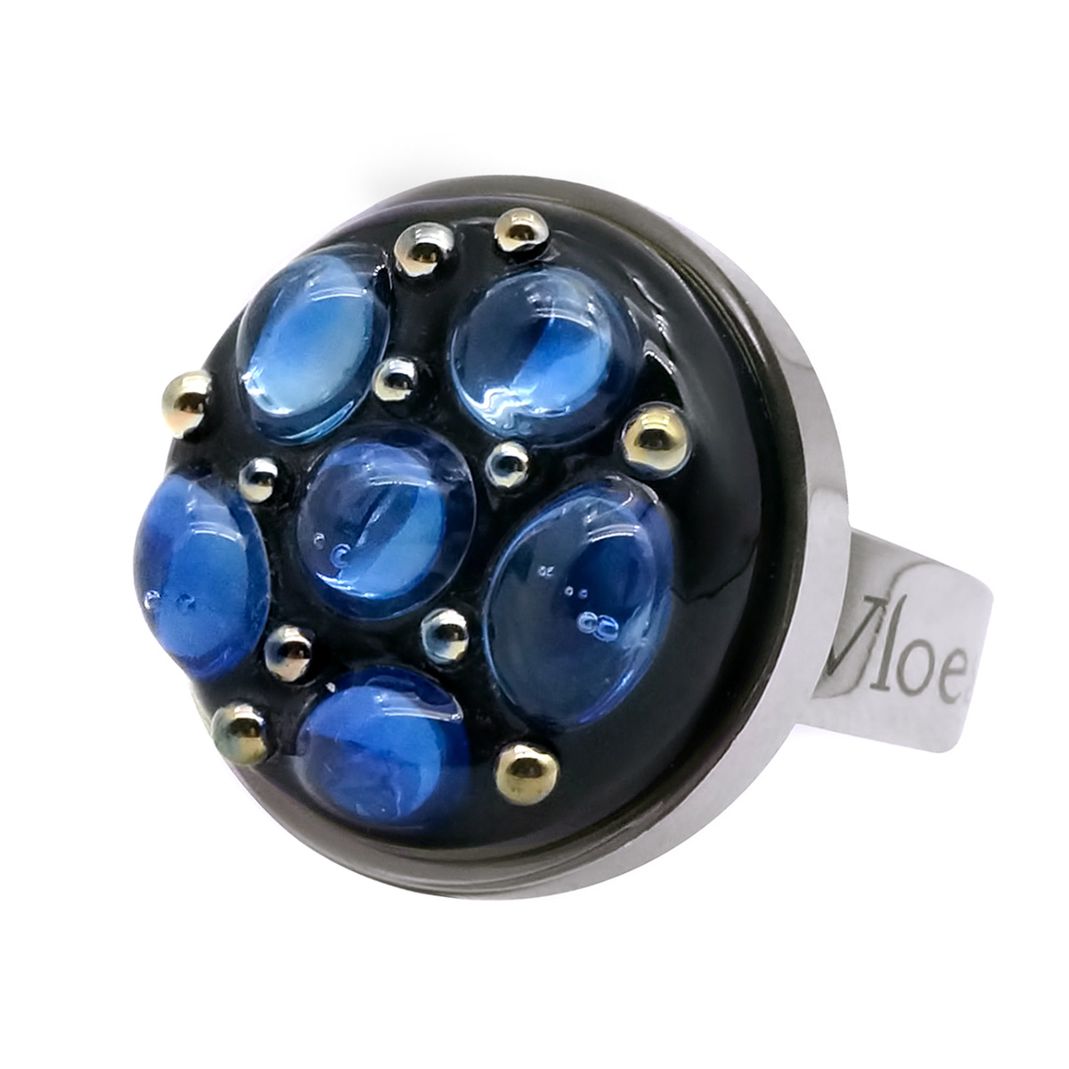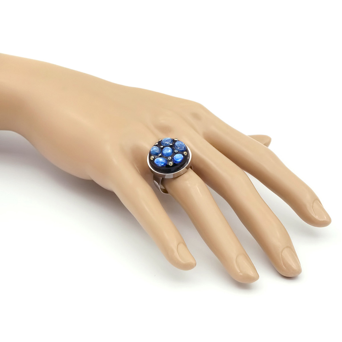 Кольцо изготовлено из муранского стекла и гипоаллергенной ювелирной стали, что очень важно для людей с чувствительной кожей. Металл не темнеет и не подвергается воздействиям окружающей среды, надолго обеспечивая красивый внешний вид изделия. Диаметр стеклянного элемента - 2 см. Кольцо безразмерное, регулируется с 16 до 19 размера. Вес - 8 гр.