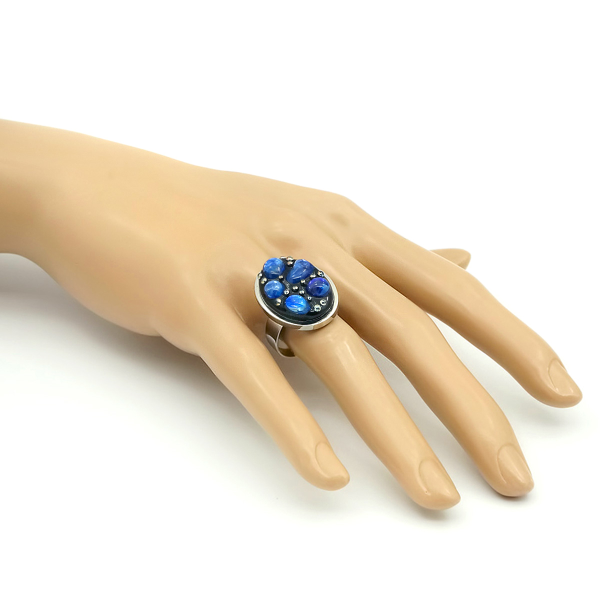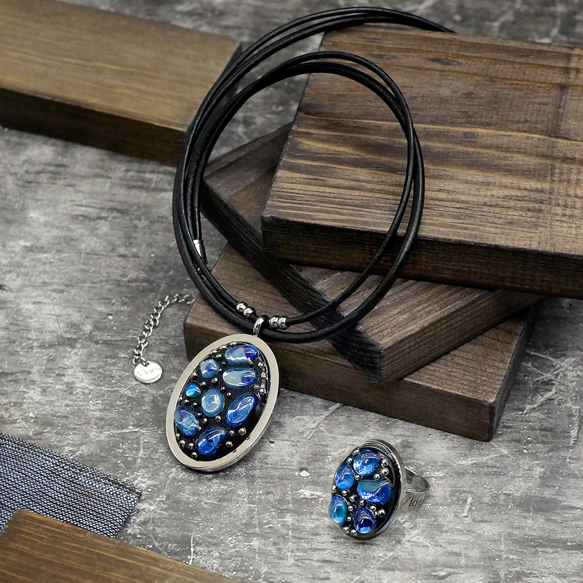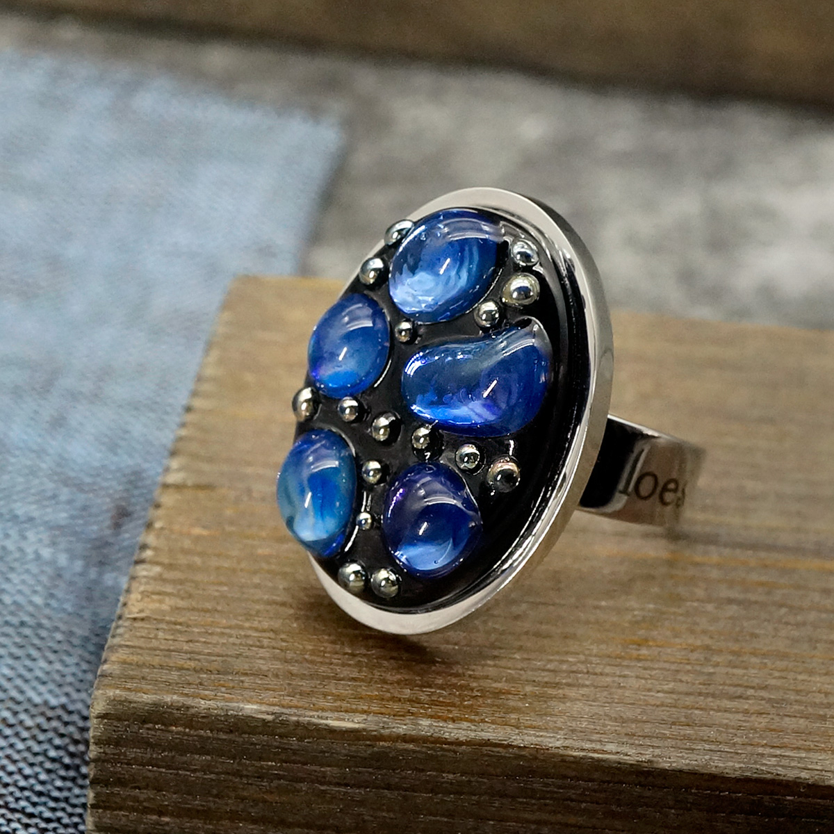 Кольцо изготовлено из муранского стекла и гипоаллергенной ювелирной стали, что очень важно для людей с чувствительной кожей. Металл не темнеет и не подвергается воздействиям окружающей среды, надолго обеспечивая красивый внешний вид изделия.  Размер стеклянного элемента - 1,9*2,6 см. Кольцо безразмерное, регулируется с 16 до 19 размера. Вес - 8 гр.