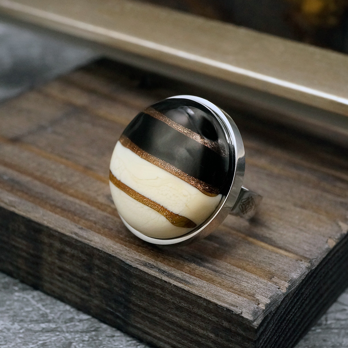Кольцо изготовлено из муранского стекла и гипоаллергенной ювелирной стали, что очень важно для людей с чувствительной кожей. Металл не темнеет и не подвергается воздействиям окружающей среды, надолго обеспечивая красивый внешний вид изделия. Диаметр стеклянного элемента - 2,5 см. Кольцо безразмерное, регулируется с 16 до 19 размера. Вес - 12 гр.