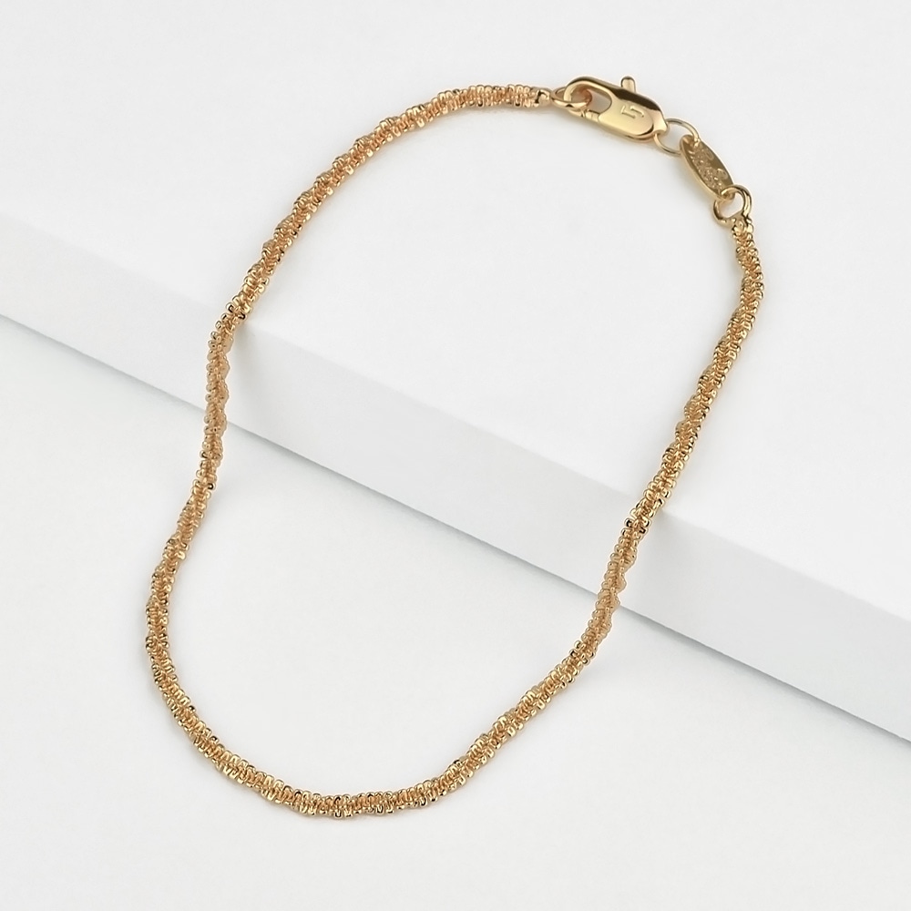 Этот браслет словно соткан из множества золотистых нитей. Утончённое изящество и непередаваемый шарм украшения делают его стильным акцентом на руке своей обладательницы. Невероятно нежное, но вместе с тем прочное плетение "Сингапур", в сочетании с надёжным креплением, позволяют такому браслету быть незаменимым в повседневном использовании.
