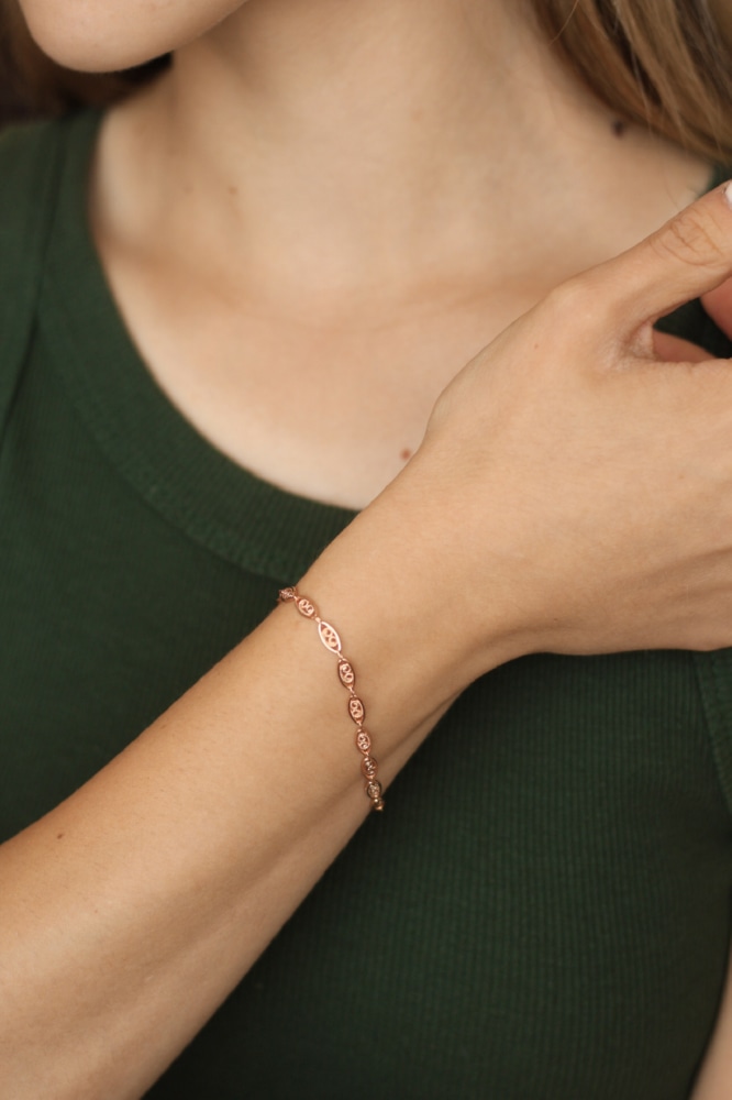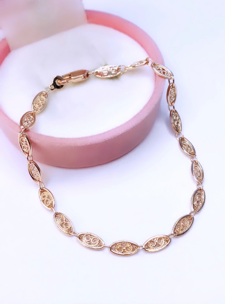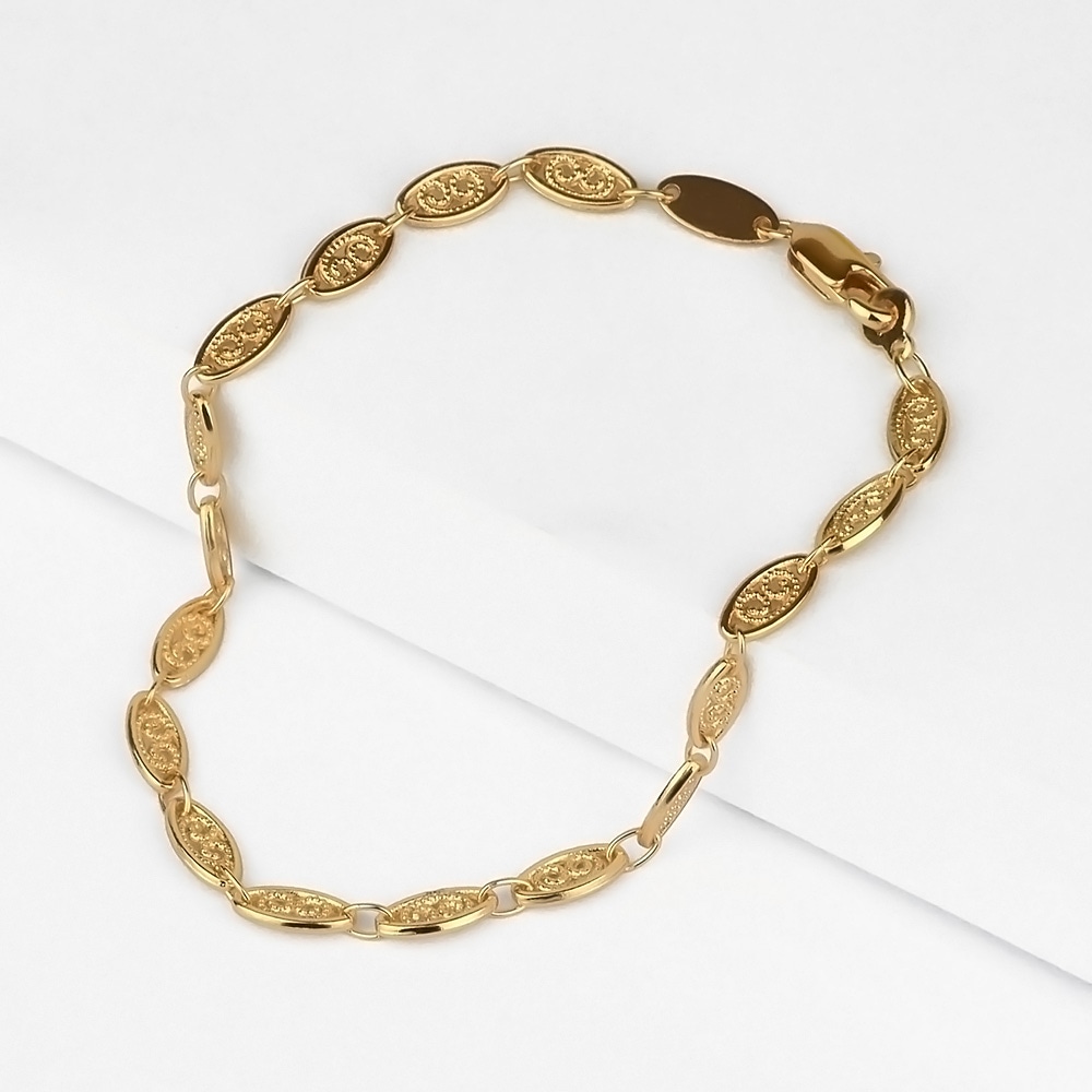 Каждое звено этого браслета представляет собой завершённое ювелирное творение. Блеск и переливы золотистого металла придают аксессуару игривую нотку, а сочетание узоров внутри звена с овальной формой позволяют украшению быть оригинальным и изысканным. Такой браслет непременно подарит своей обладательнице восхищённые взгляды и комплименты окружающих.