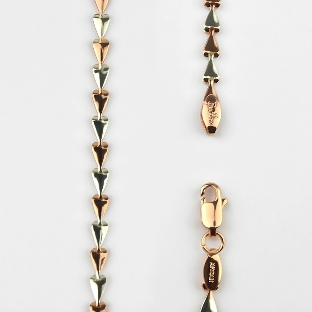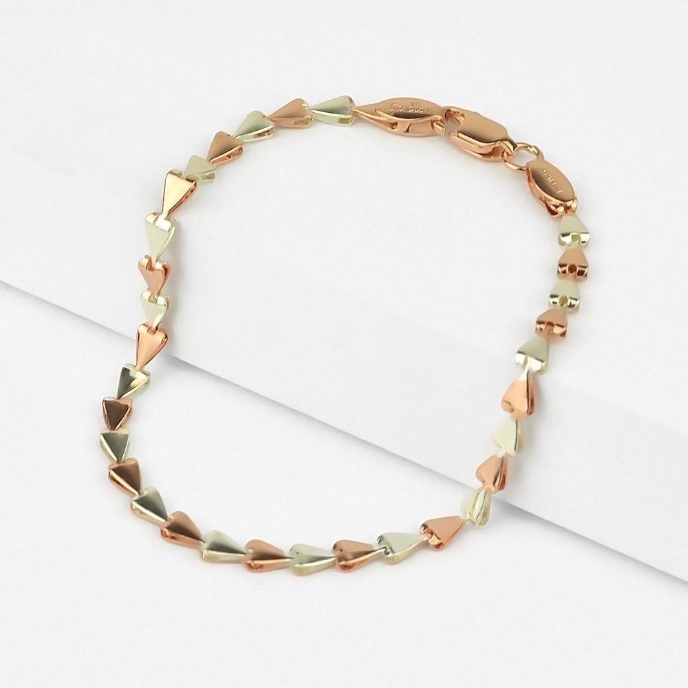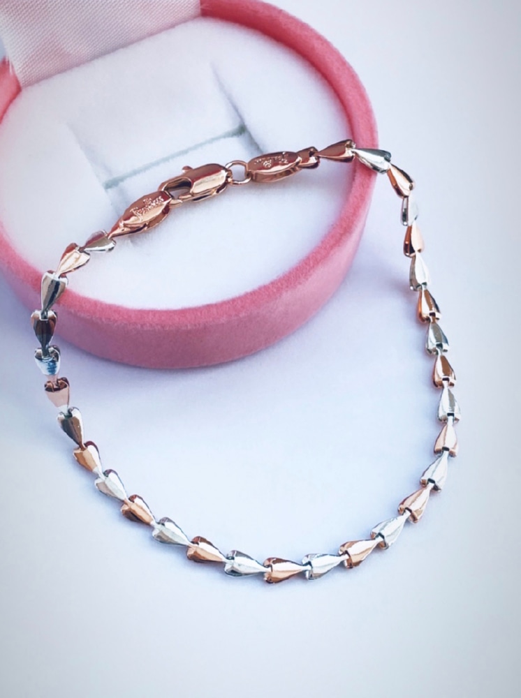 Нежный браслет, сочетающий в себе цвета платинового и золотого металла, состоит из множества небольших сердечек. Великолепная игра оттенков и фантазийная форма призваны добавить утончённой элегантности образу своей обладательницы. Этот браслет непременно будет гармоничным дополнением индивидуального стиля, а также сможет послужить отличным подарком для любительницы необычных украшений.