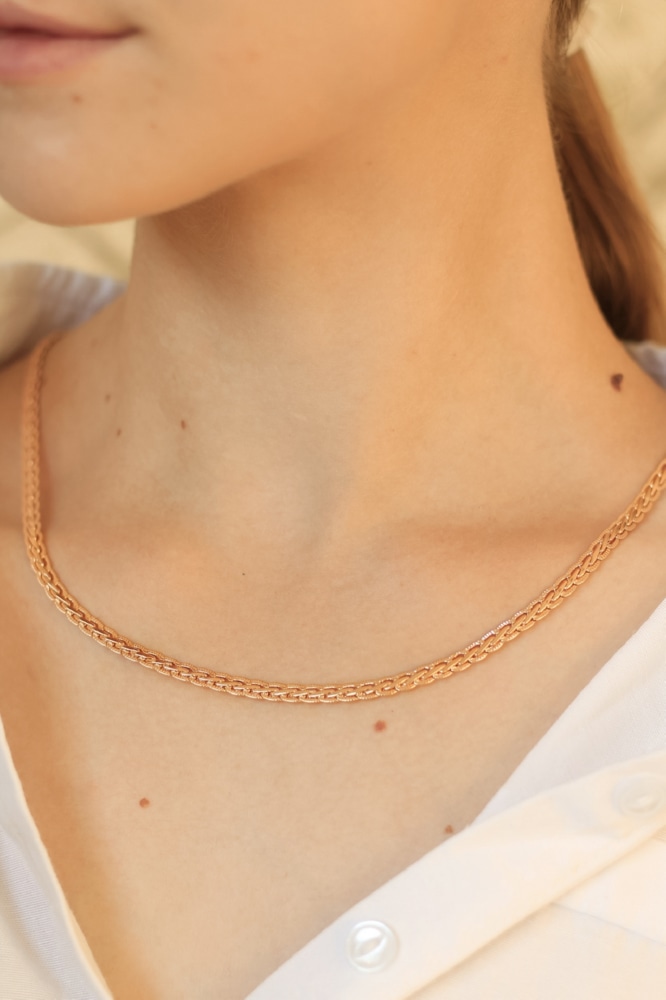 Оригинальная и яркая цепь, напоминающая форму косы, непременно понравится любительницам стильных и эффектных украшений. Такое изделие сможет стать центральной нотой делового или вечернего образа. А искусное исполнение и надёжная техника плетения сделает эту цепь долговечной и комфортной в использовании.