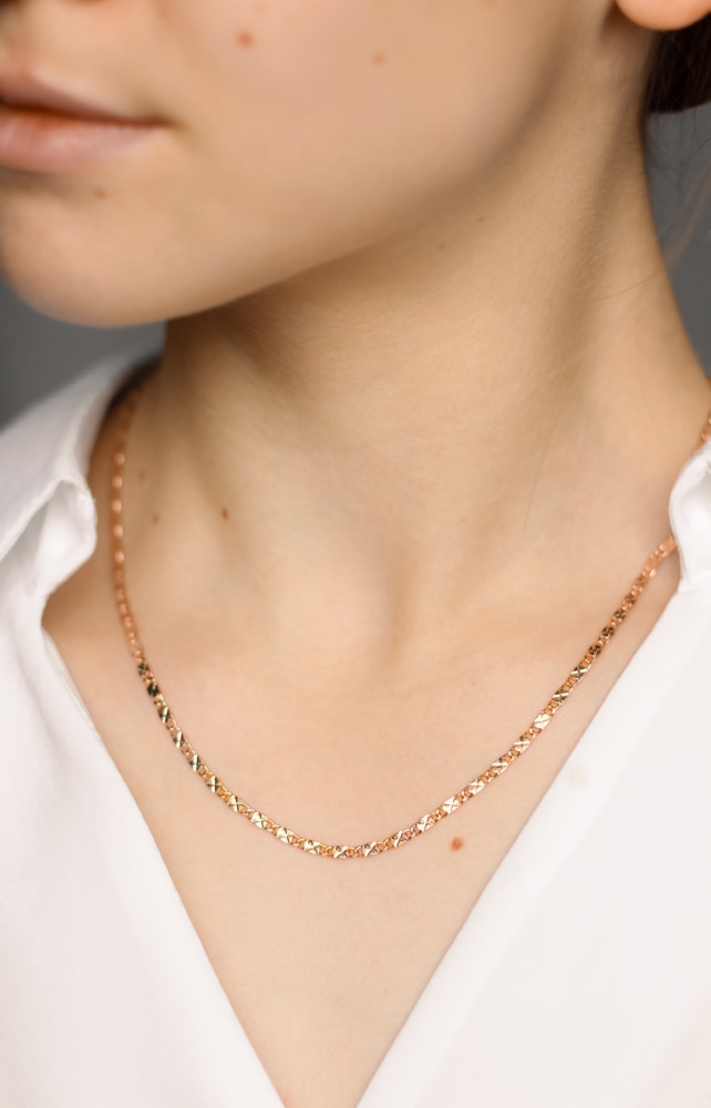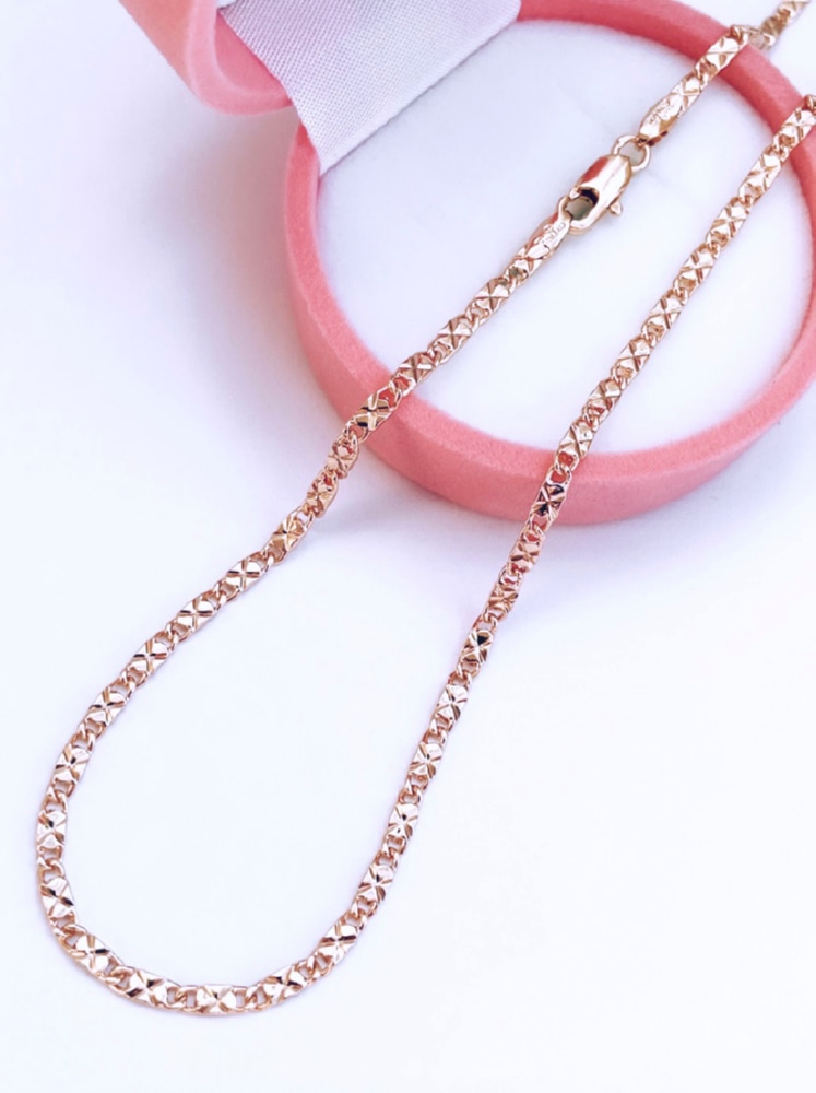 Игривое мерцание света в каждом звене этой цепи, придётся по вкусу любительницам кокетливых и изящных украшений. Золотистый узор прекрасно выглядит в качестве самостоятельного акцента и не нуждается в дополнении подвесками или кулонами. Такая цепь сможет внести свою неповторимую изюминку в деловой стиль или дополнить свободный повседневный образ.