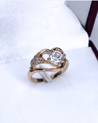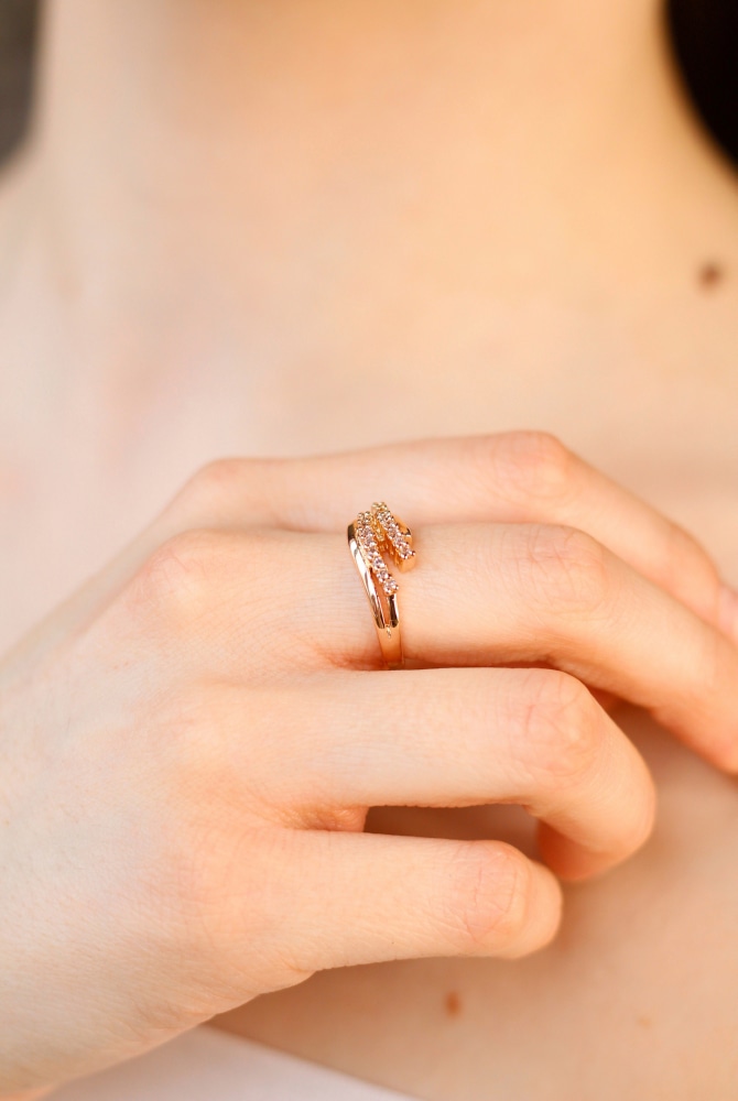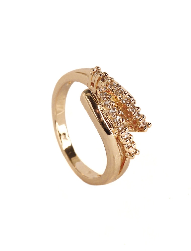 Стильный облик этого кольца достигается за счёт сочетания лаконичных линий, глянца золотистого металла и крошечных цирконов, венчающих композицию изделия. Не вычурное и вместе с тем заметное, такое украшение сможет подчеркнуть красоту рук своей обладательницы. Прозрачные минералы прекрасно сочетаются с другими аксессуарами и цветными камнями, или самостоятельно дополняют ваш элегантный образ.