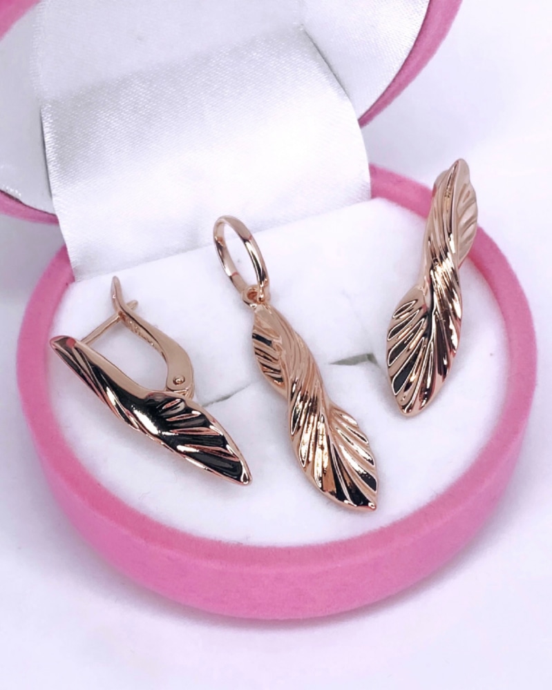 Экстравагантный и притягательный облик этого комплекта порадует любительниц оригинальных, выделяющихся из множества других аксессуаров, украшений. Отсутствие вставок из минералов компенсируется необычной, словно струящейся формой изделий. Изгибы золотистого металла позволяют нежно сиять лучам света от самого небольшого движения рук или головы своей обладательницы. А не вычурное исполнение гармонично дополнит множество образов.
