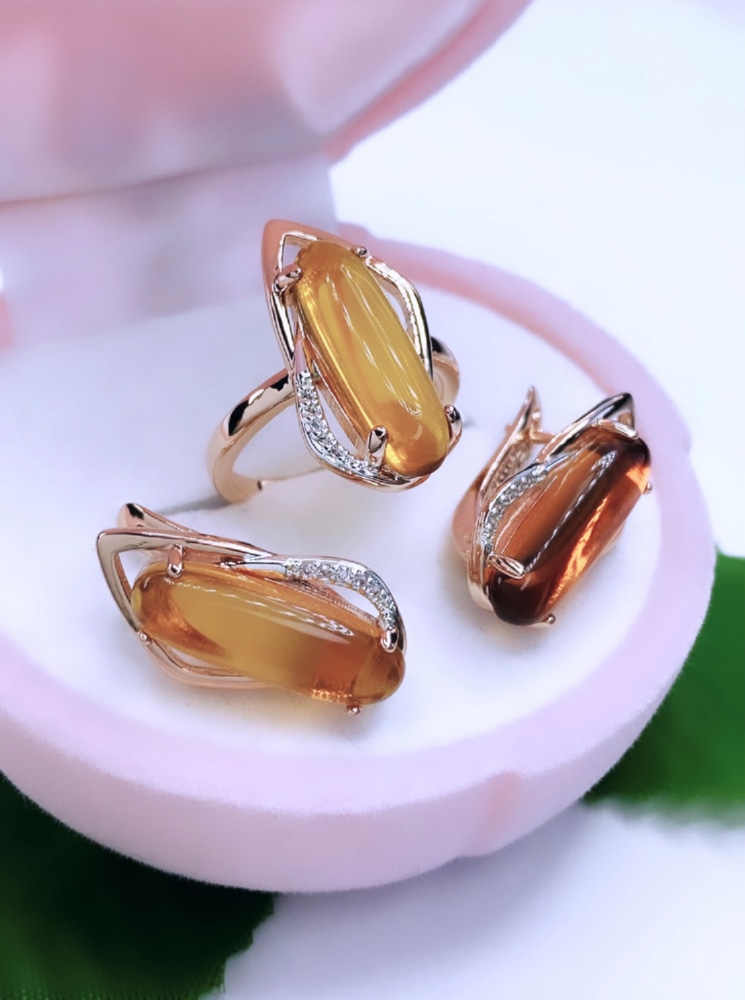 Янтарный цвет в украшениях призван подчеркнуть пытливый ум, жизненную энергию и очарование своей обладательницы. Комплект из искусственного янтаря имеет притягательный облик и яркий дизайн. Такие аксессуары гармонично выглядят как в дневном, так и в вечернем образе и неизменно подчёркивают незаурядность своей владелицы.