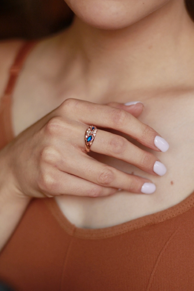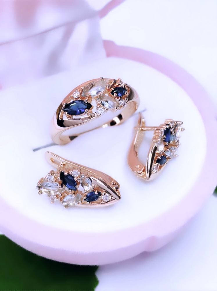 Элегантный комплект, состоящий из серёг и кольца, украшенных прозрачными и тёмно-синими минералами, выглядит стильно и презентабельно. Сдержанная роскошь аксессуаров способна добавить выразительности и шарма вечернему платью, или сформировать вокруг себя дневной образ. Этот комплект станет выразительным дополнением вашего стиля и не раз выручит в ситуации, когда нужно подчеркнуть всю свою харизматичность и красоту.