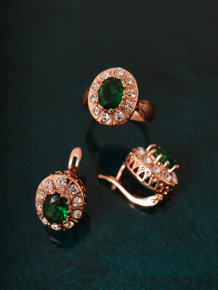 Минералы изумрудного цвета, используемые в ювелирных украшениях, притягивают к своей обладательнице удачу и дарят спокойствие. Изумительный комплект, основой которого выступают зелёные камни, дополненные небольшими сверкающими цирконами, придаст своей владелице шарм и непередаваемое обаяние. Притягательный облик аксессуаров оттенит даже самый строгий деловой костюм, или станет гармоничным дополнением вечернего образа.