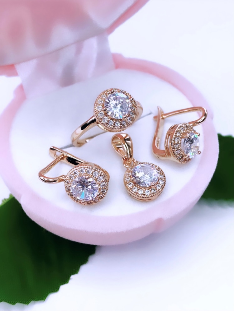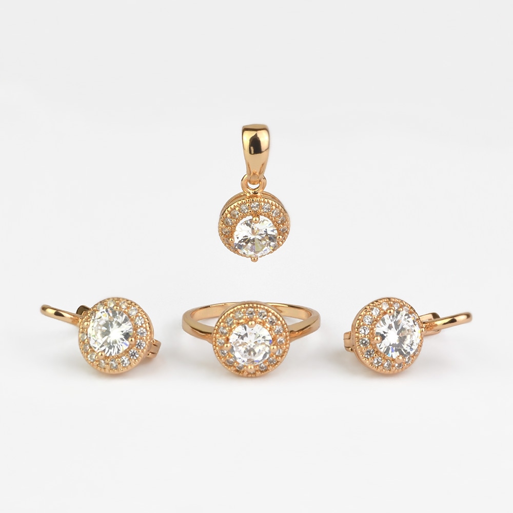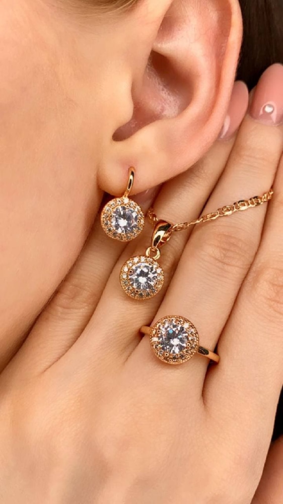 Тандем из серёг, кулона и кольца, выглядит элегантно и добавит статусности и шарма своей обладательнице. Лаконичное и вместе с тем яркое исполнение аксессуаров, позволяет им быть уместным как в деловом стиле так и в вечернем образе. Хотите выделяться и блистать на фоне окружающих? Такой комплект непременно вам в этом поможет.