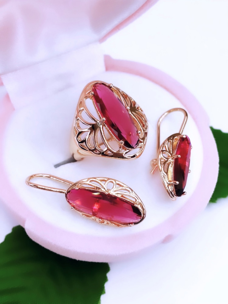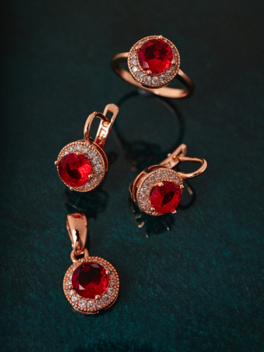 Алый цвет в украшениях символизирует яркий темперамент и пылкую страсть. Комплект, основной нотой которого выступает красный циркон, прекрасно подойдёт харизматичной и смелой представительнице прекрасного пола. Он способен стать основным элементом повседневного образа, или гармонично дополнить вечернее платье. Такой комплект непременно привлечёт к вам внимание и комплименты окружающих.