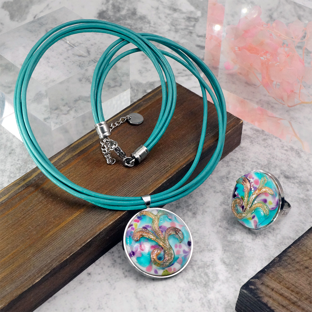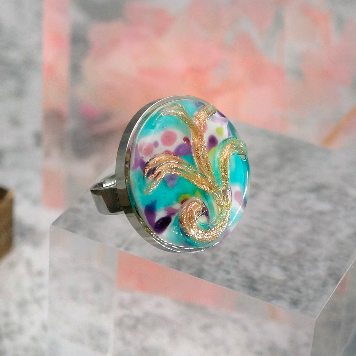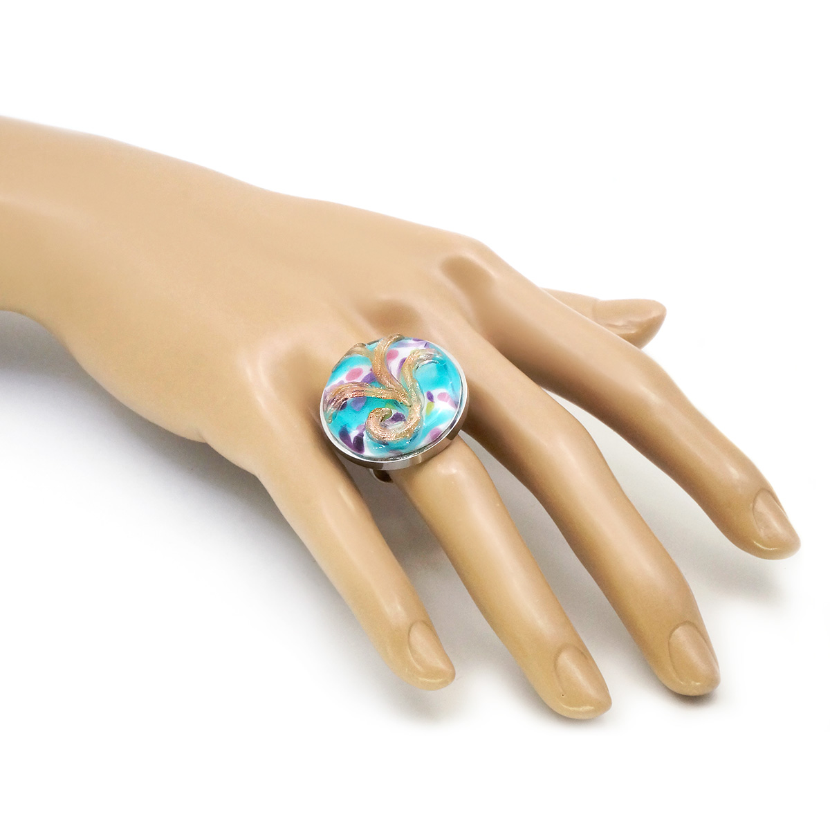 Кольцо изготовлено из муранского стекла и гипоаллергенной ювелирной стали, что очень важно для людей с чувствительной кожей. Металл не темнеет и не подвергается воздействиям окружающей среды, надолго обеспечивая красивый внешний вид изделия. Диаметр стеклянного элемента - 2,5 см. Кольцо безразмерное, регулируется с 16 до 19 размера. Вес - 12 гр.