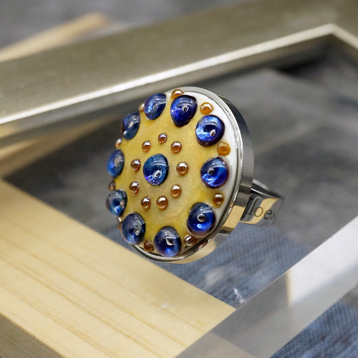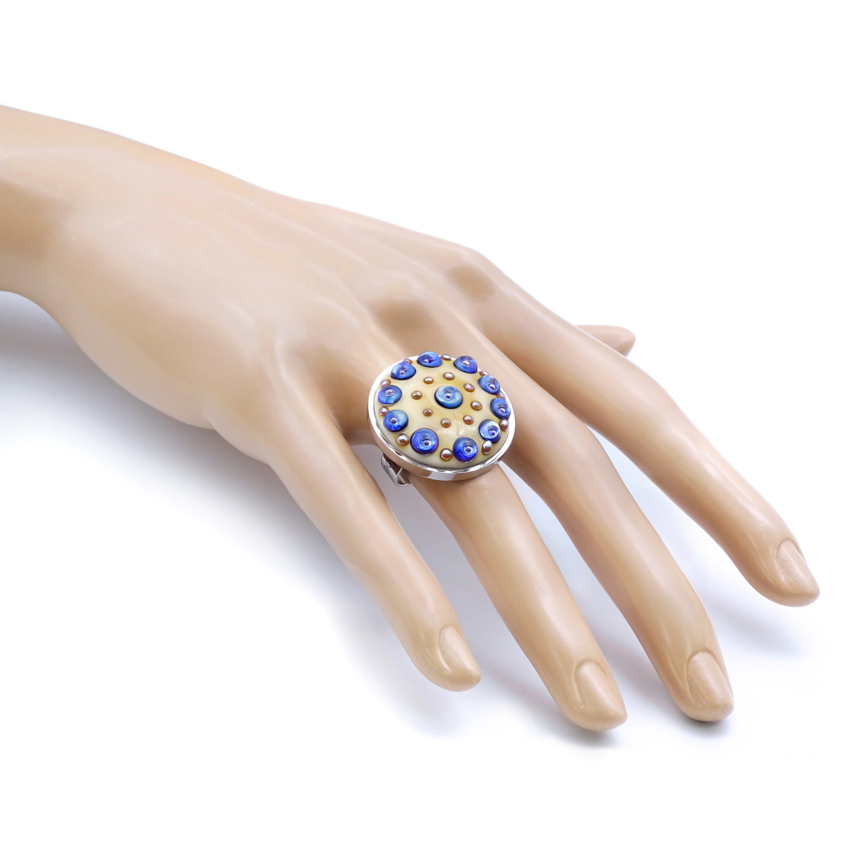 Кольцо изготовлено из муранского стекла и гипоаллергенной ювелирной стали, что очень важно для людей с чувствительной кожей. Металл не темнеет и не подвергается воздействиям окружающей среды, надолго обеспечивая красивый внешний вид изделия. Диаметр стеклянного элемента - 2,5 см. Кольцо безразмерное, регулируется с 16 до 19 размера. Вес - 12 гр.
