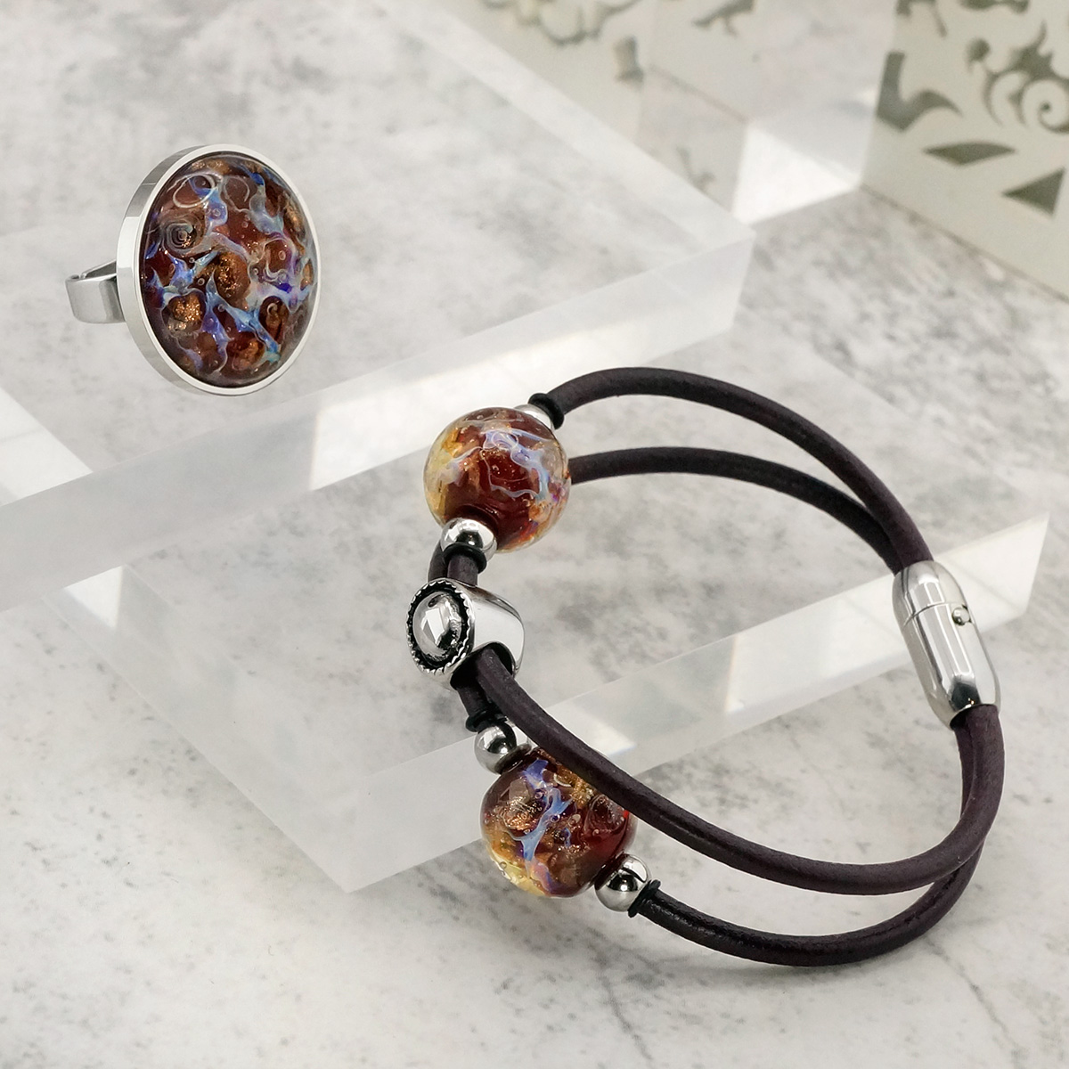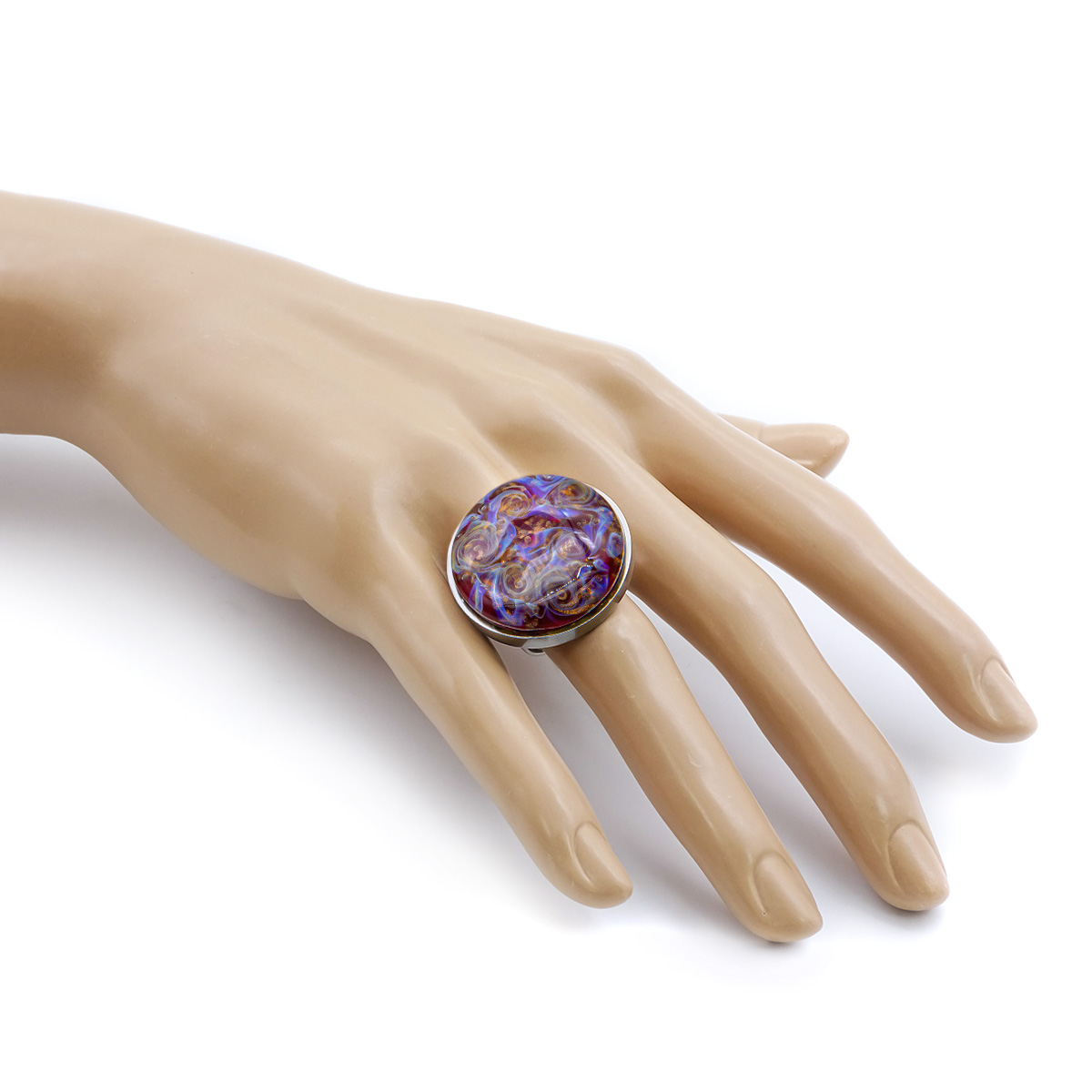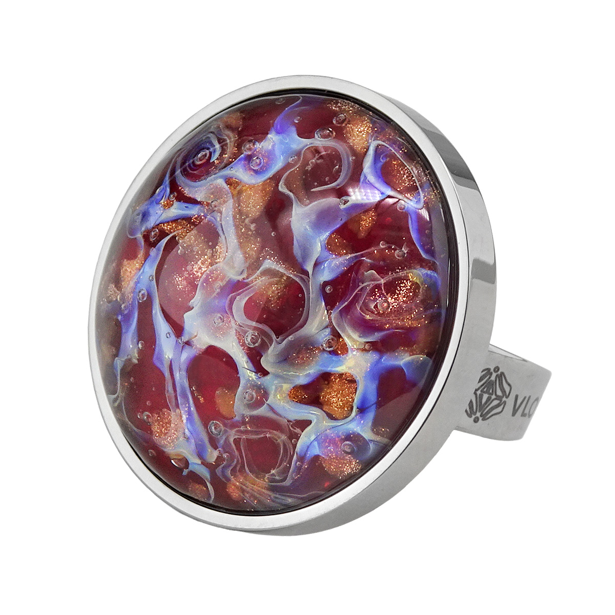 Кольцо изготовлено из муранского стекла и гипоаллергенной ювелирной стали, что очень важно для людей с чувствительной кожей. Металл не темнеет и не подвергается воздействиям окружающей среды, надолго обеспечивая красивый внешний вид изделия. Диаметр стеклянного элемента - 2,5 см. Кольцо безразмерное, регулируется с 16 до 19 размера. Вес - 12 гр.