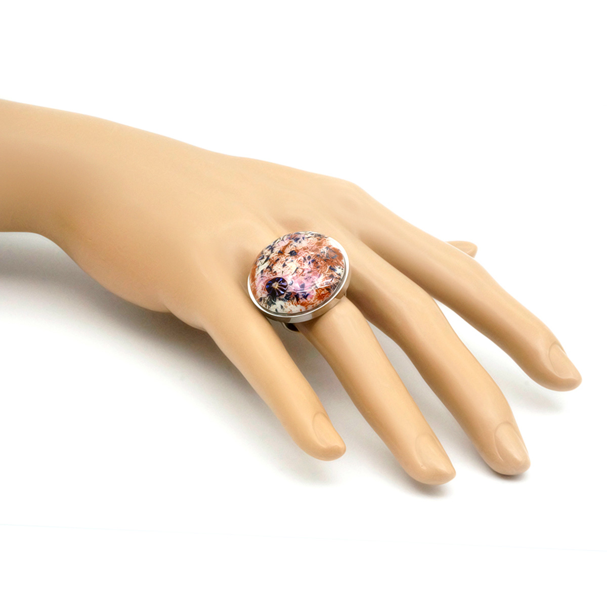 Кольцо изготовлено из муранского стекла и гипоаллергенной ювелирной стали, что очень важно для людей с чувствительной кожей. Металл не темнеет и не подвергается воздействиям окружающей среды, надолго обеспечивая красивый внешний вид изделия. Диаметр стеклянного элемента - 2,5 см. Кольцо безразмерное, регулируется с 16 до 19 размера. Вес - 12 гр.