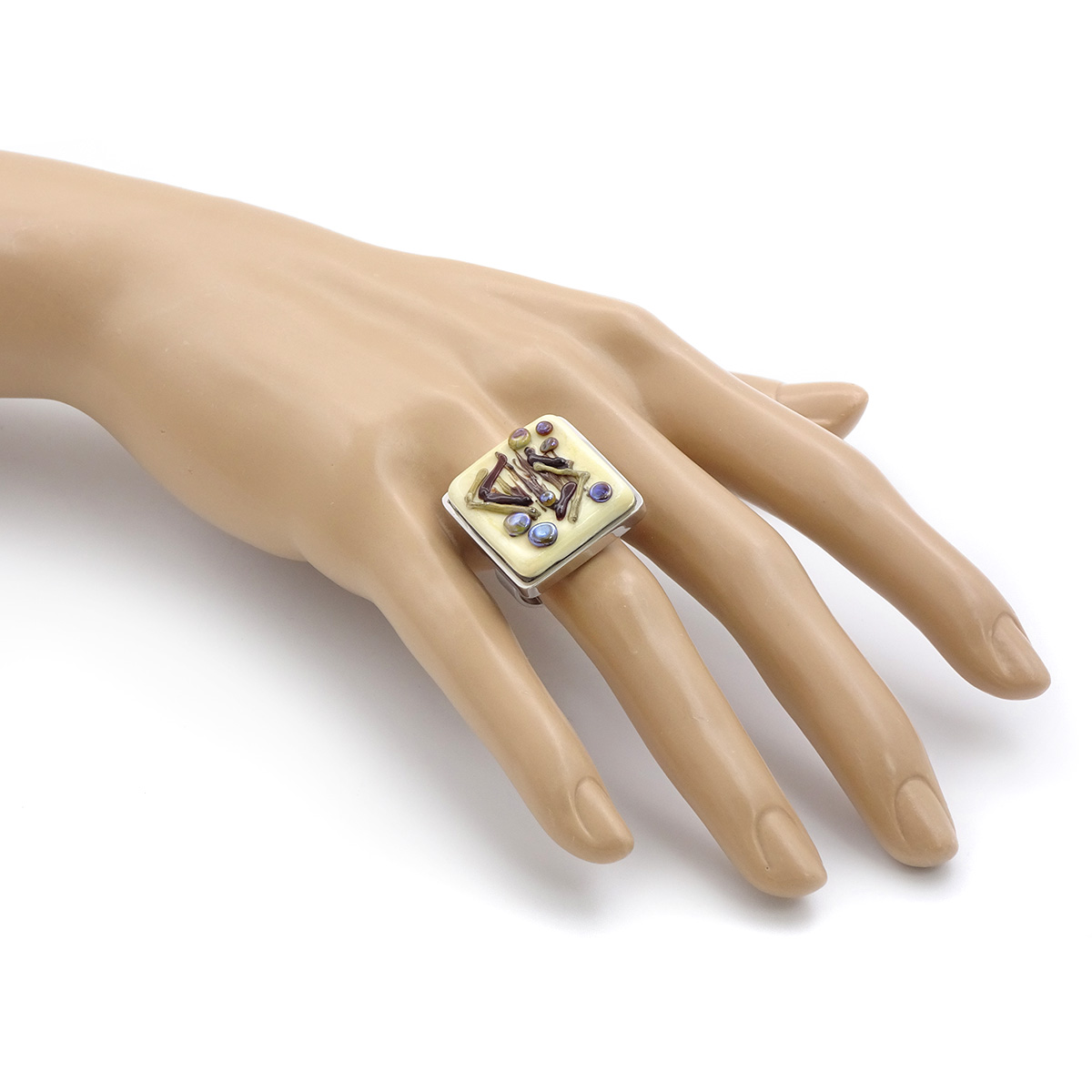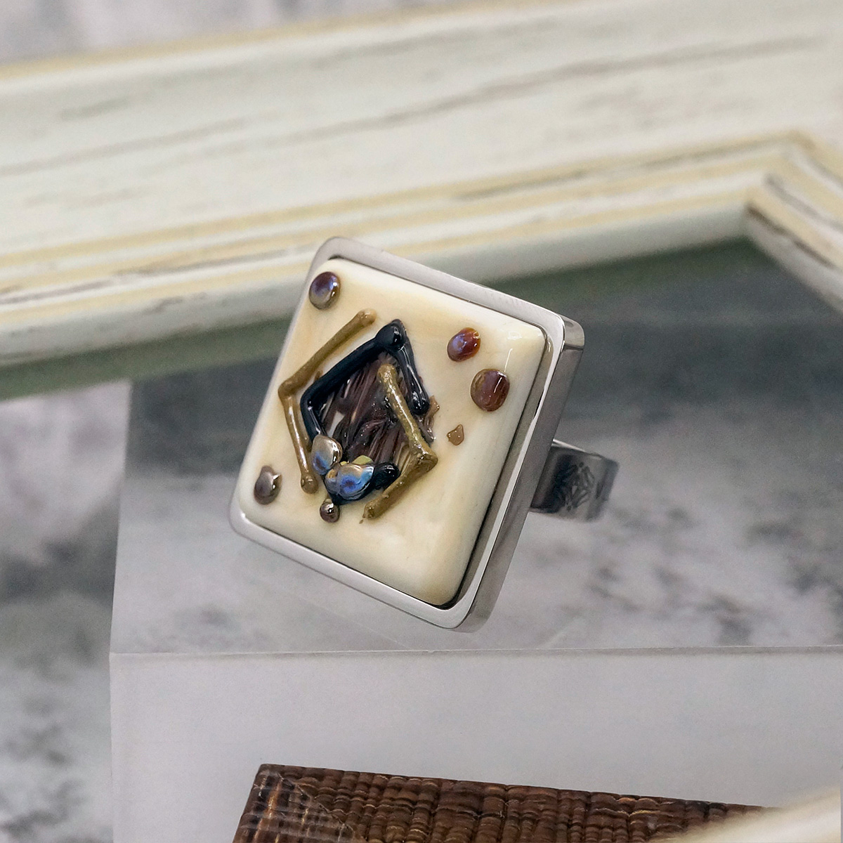Кольцо изготовлено из муранского стекла и гипоаллергенной ювелирной стали, что очень важно для людей с чувствительной кожей. Металл не темнеет и не подвергается воздействиям окружающей среды, надолго обеспечивая красивый внешний вид изделия. Размер стеклянного элемента - 2*2 см. Кольцо безразмерное, регулируется с 16 до 19 размера. Вес - 11 гр.