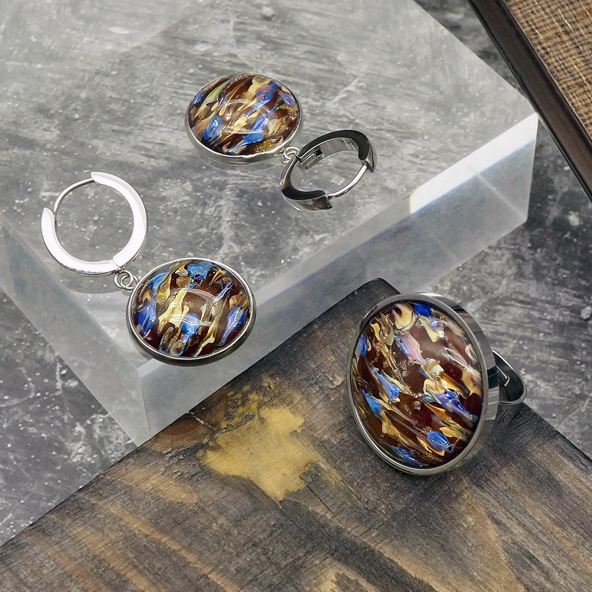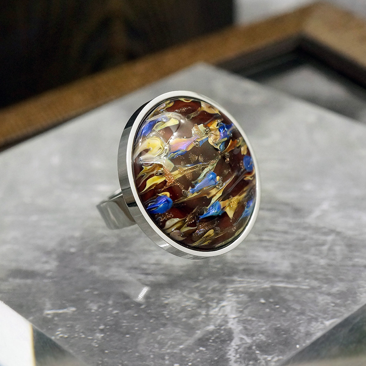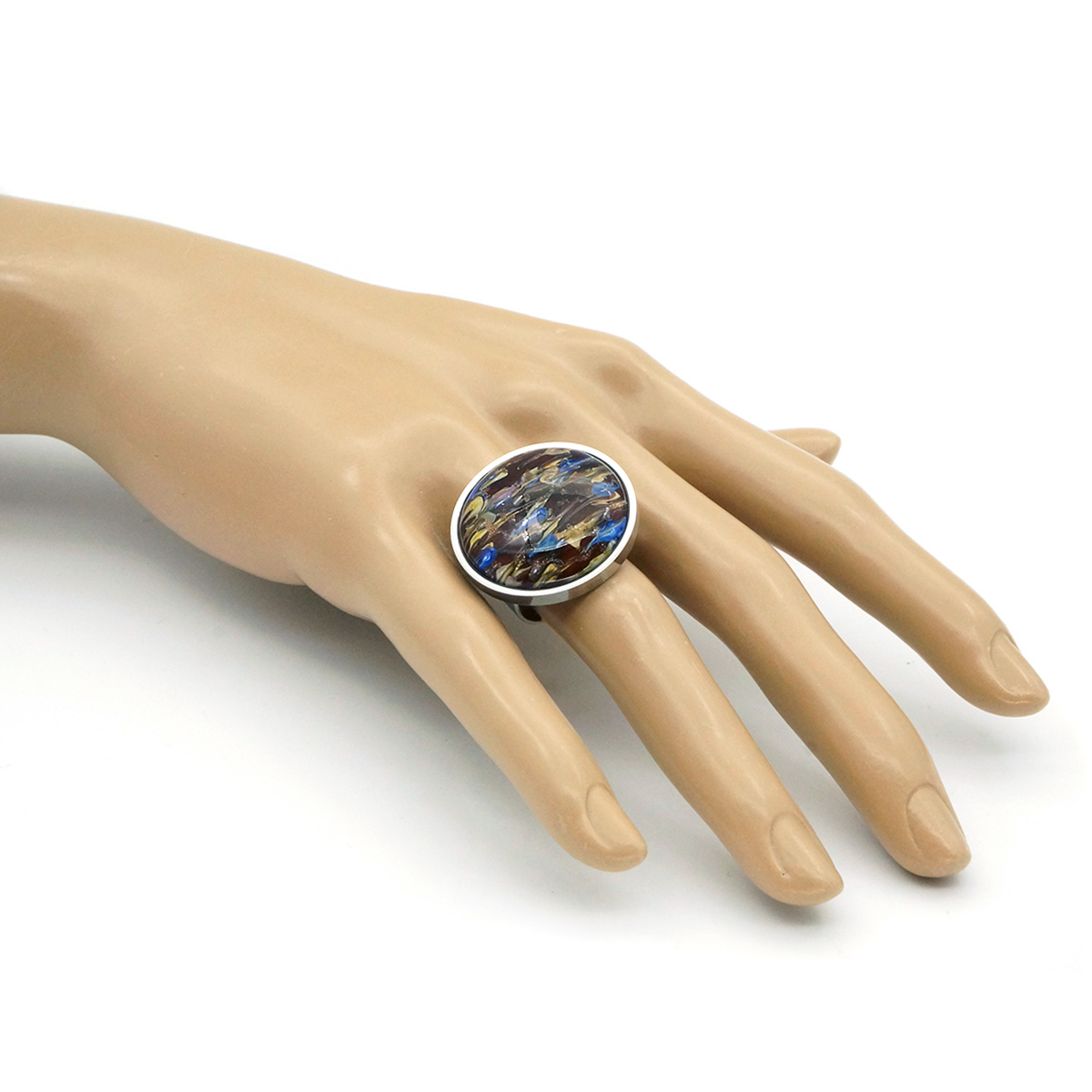 Кольцо изготовлено из муранского стекла и гипоаллергенной ювелирной стали, что очень важно для людей с чувствительной кожей. Металл не темнеет и не подвергается воздействиям окружающей среды, надолго обеспечивая красивый внешний вид изделия. Диаметр стеклянного элемента - 2,5 см. Кольцо безразмерное, регулируется с 16 до 19 размера. Вес - 12 гр.